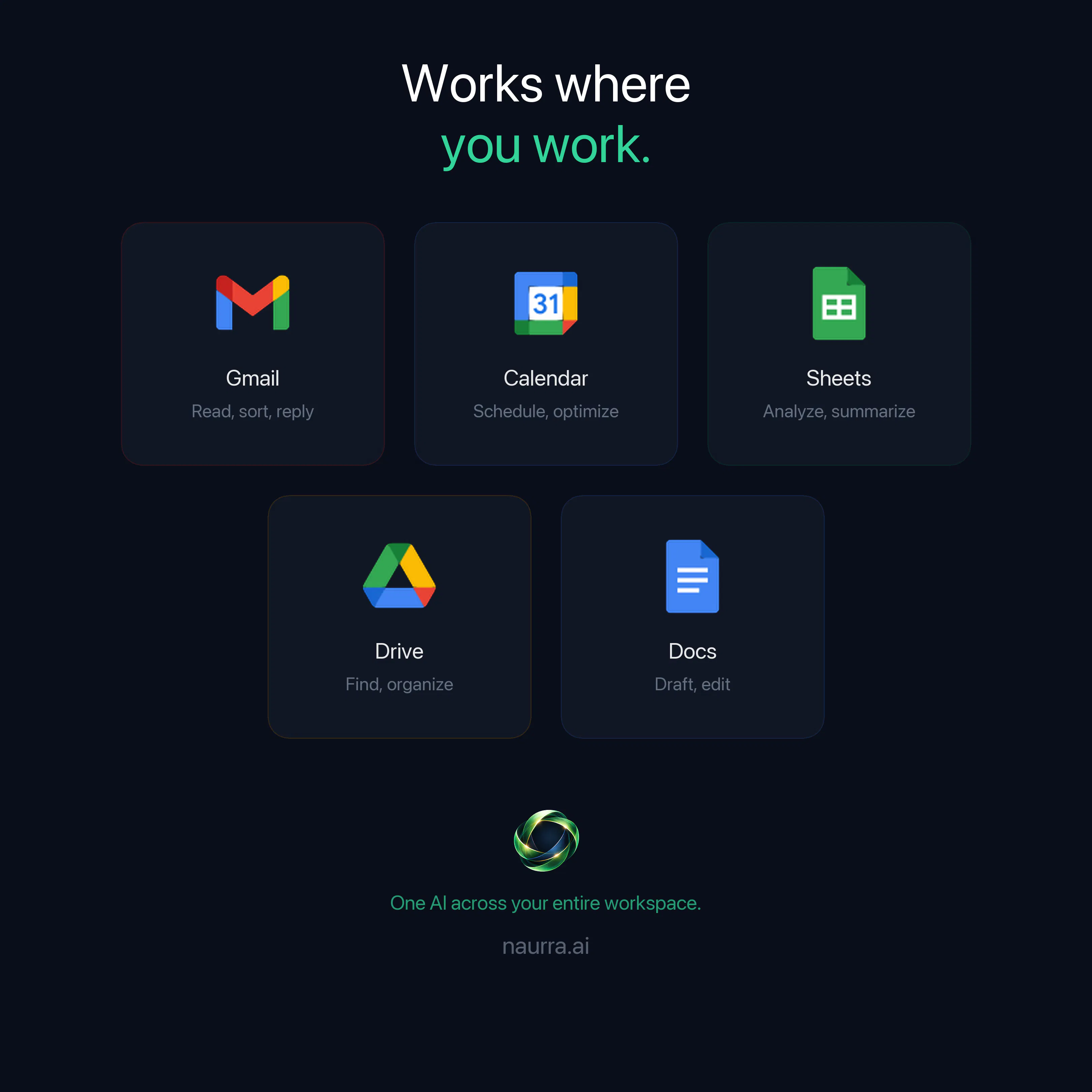Instead of opening multiple tabs and manually handling tasks, Naurra.ai operates across your entire Google Workspace from a single conversation.