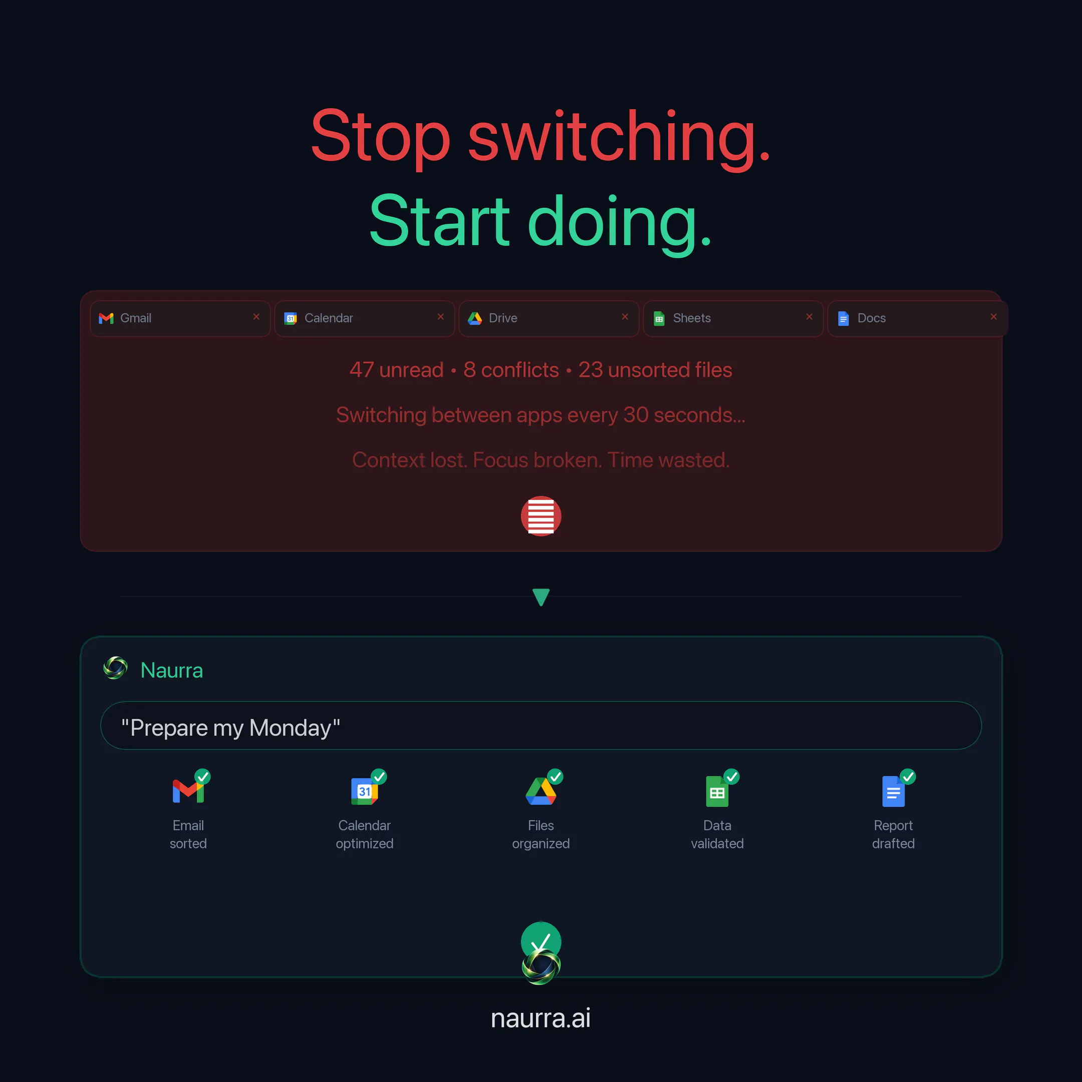 Stop juggling 12 tabs and 5 apps. One command to Naurra and everything is handled. Focus on what matters.