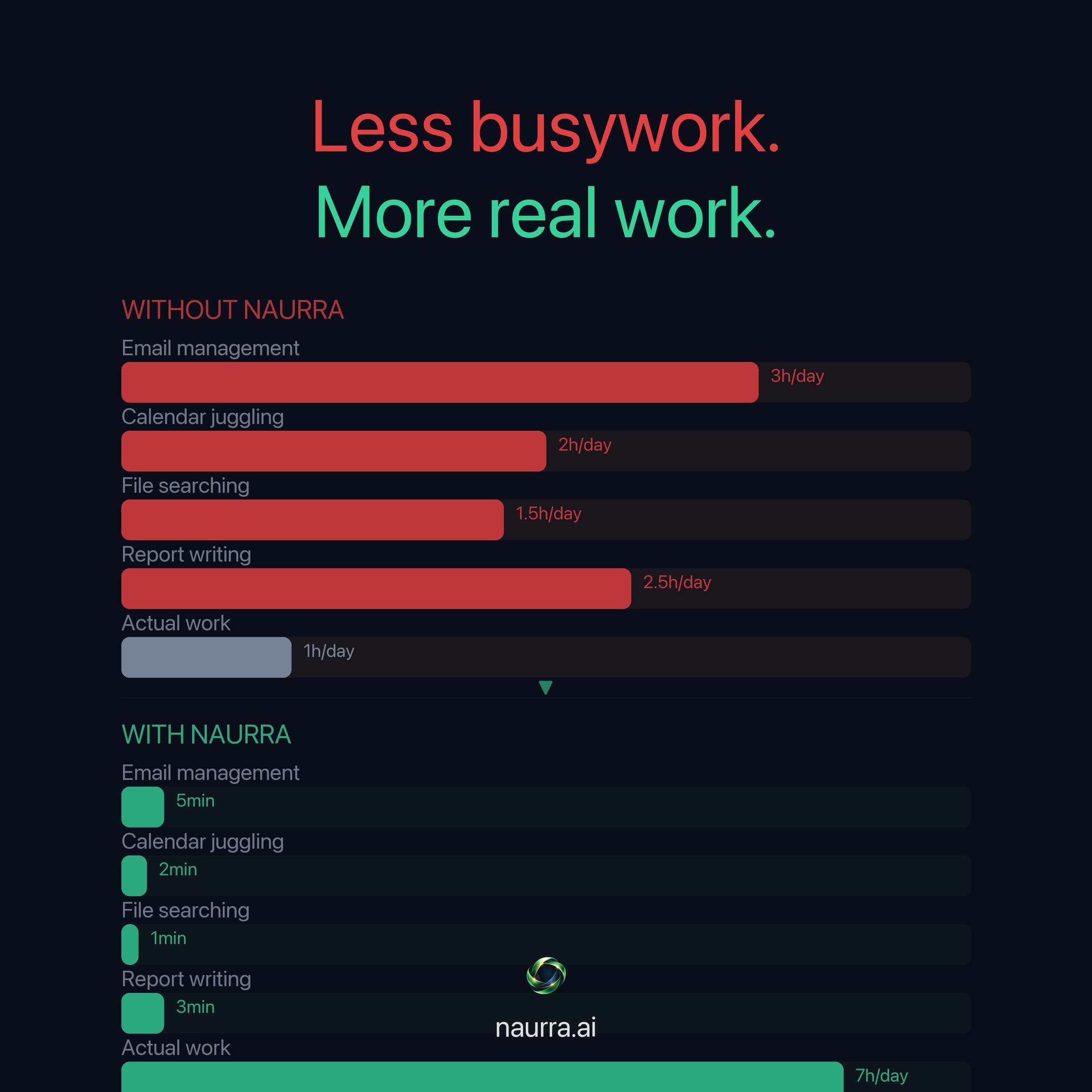 Without Naurra: 9 hours of busywork, 1 hour of real work. With Naurra: minutes of busywork, 7 hours of real work. The choice is obvious.