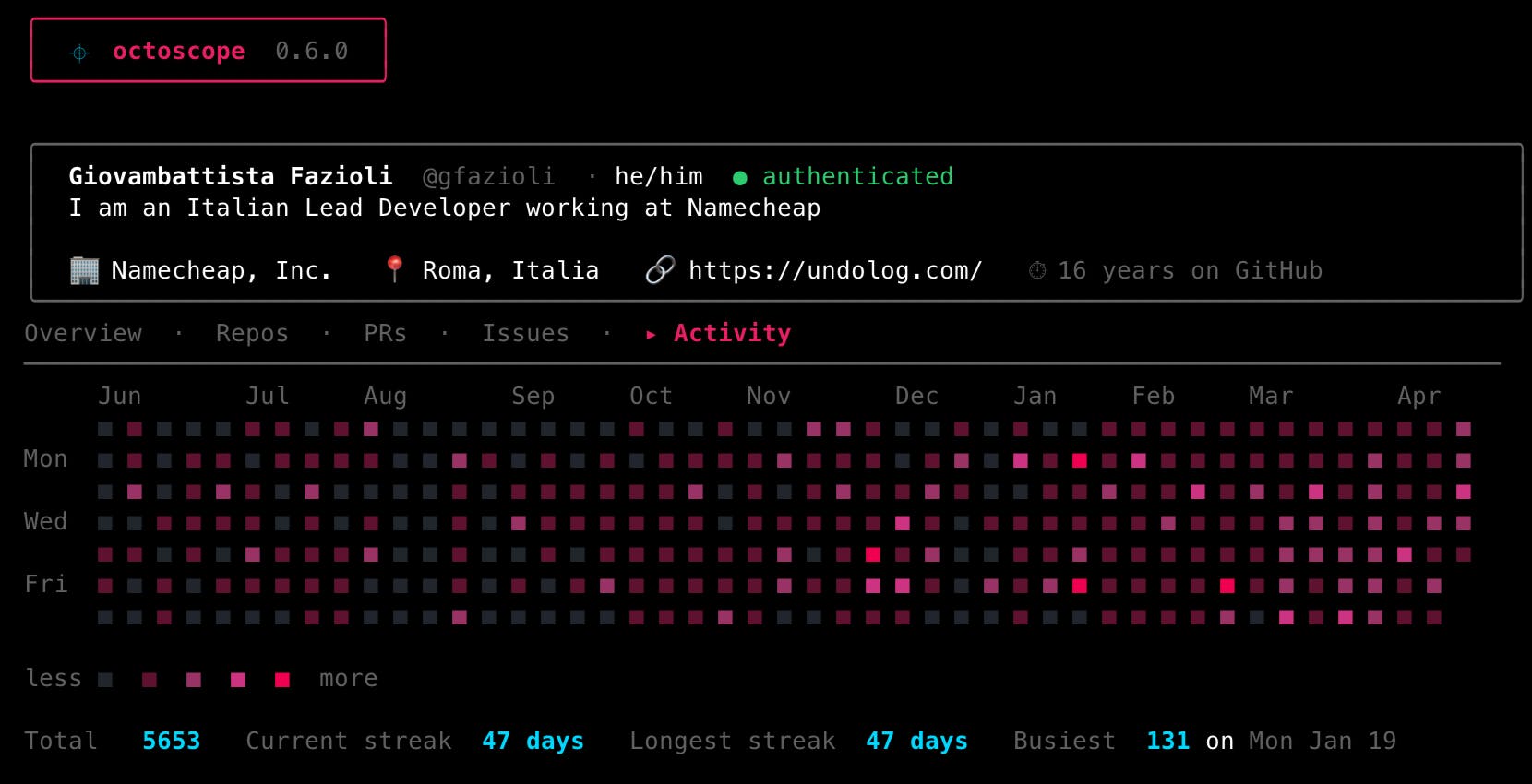 Tabs Overview Repos PRs Issues Activity. Jump with number keys 1 5 or cycle with tab / shift+tab. Your banner and profile stay pinned; only the body swaps.