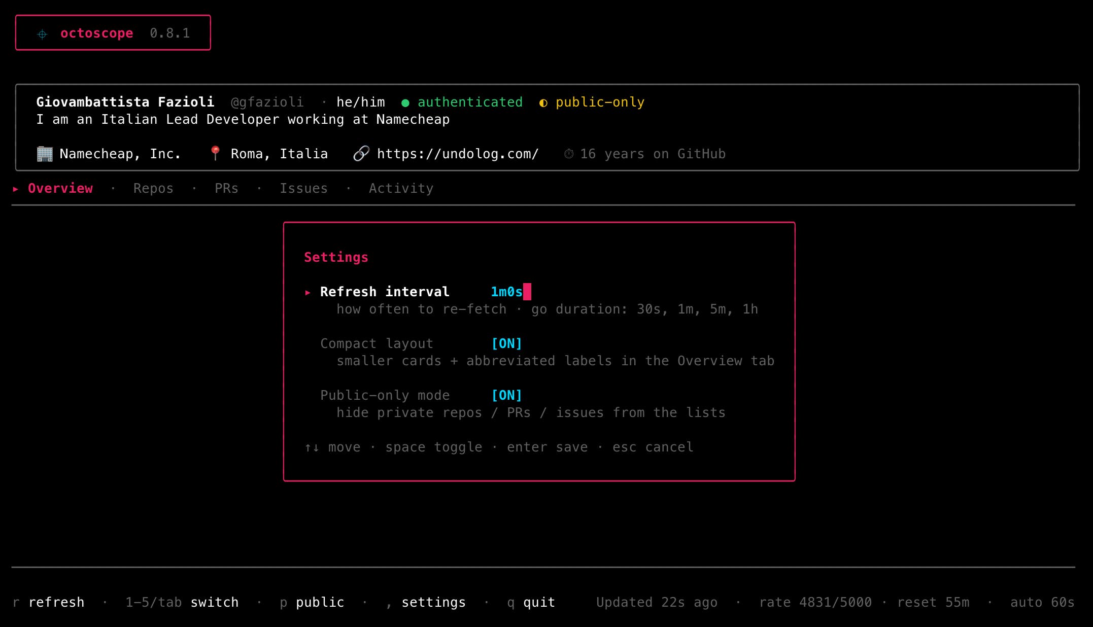 octoscope is configurable now. v0.8 lands the configuration story we've been building toward split across two patches but one product idea: octoscope should adapt to your habits, not the other way around.