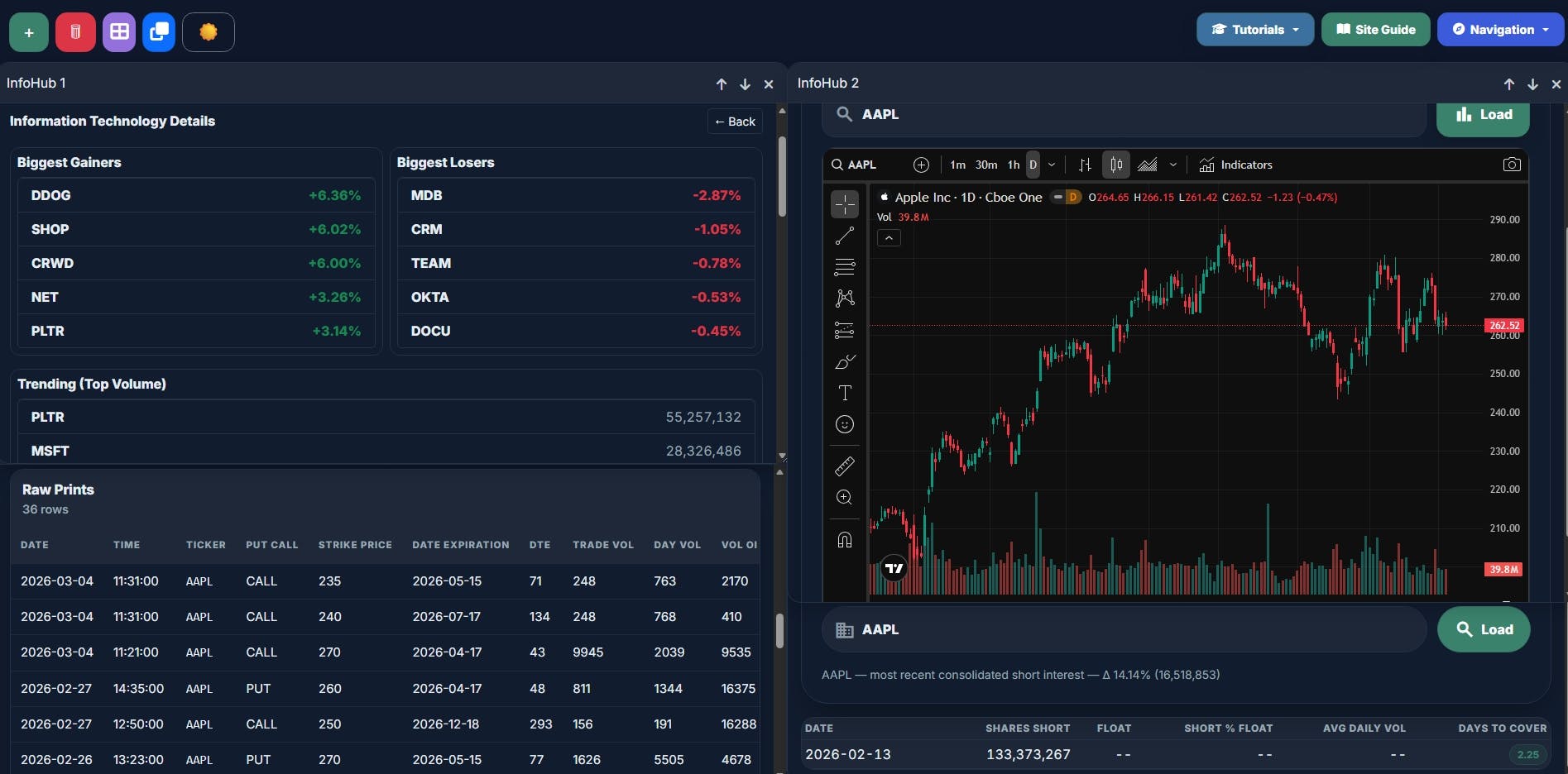 What's featured in the image below is a snapshot from our market overview bucket, which we have clicked into the information technology sector for, the latest unusual options activity for AAPL, the trading view widget, and a FINRA supplied showcase of AAPL's open short interest as of FINRA's last update. The boxes you see are moveable, resizable, and can host any of the available data options.