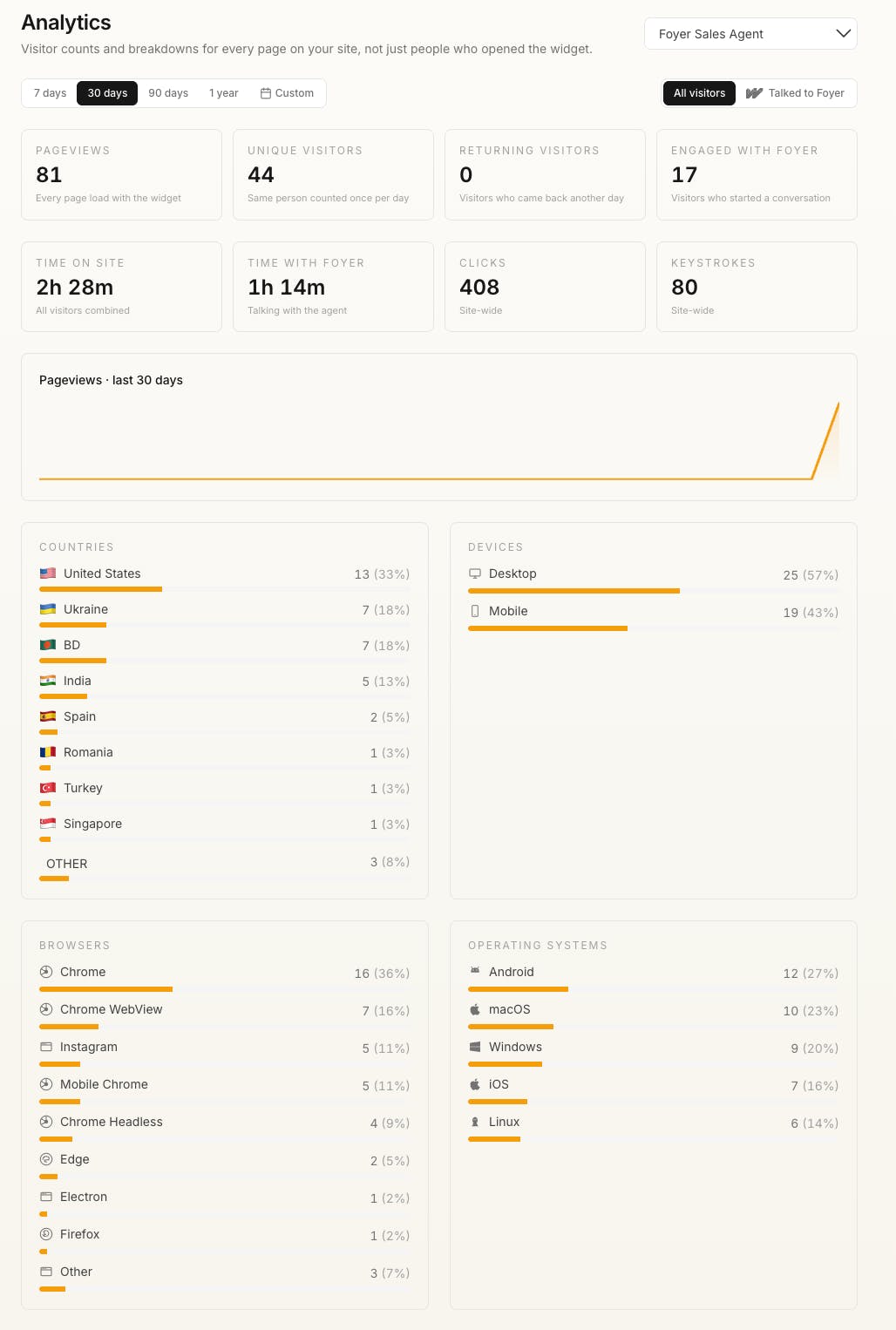 Per-agent analytics (country, device, engagement, returning visitors, even bot/spam detection)