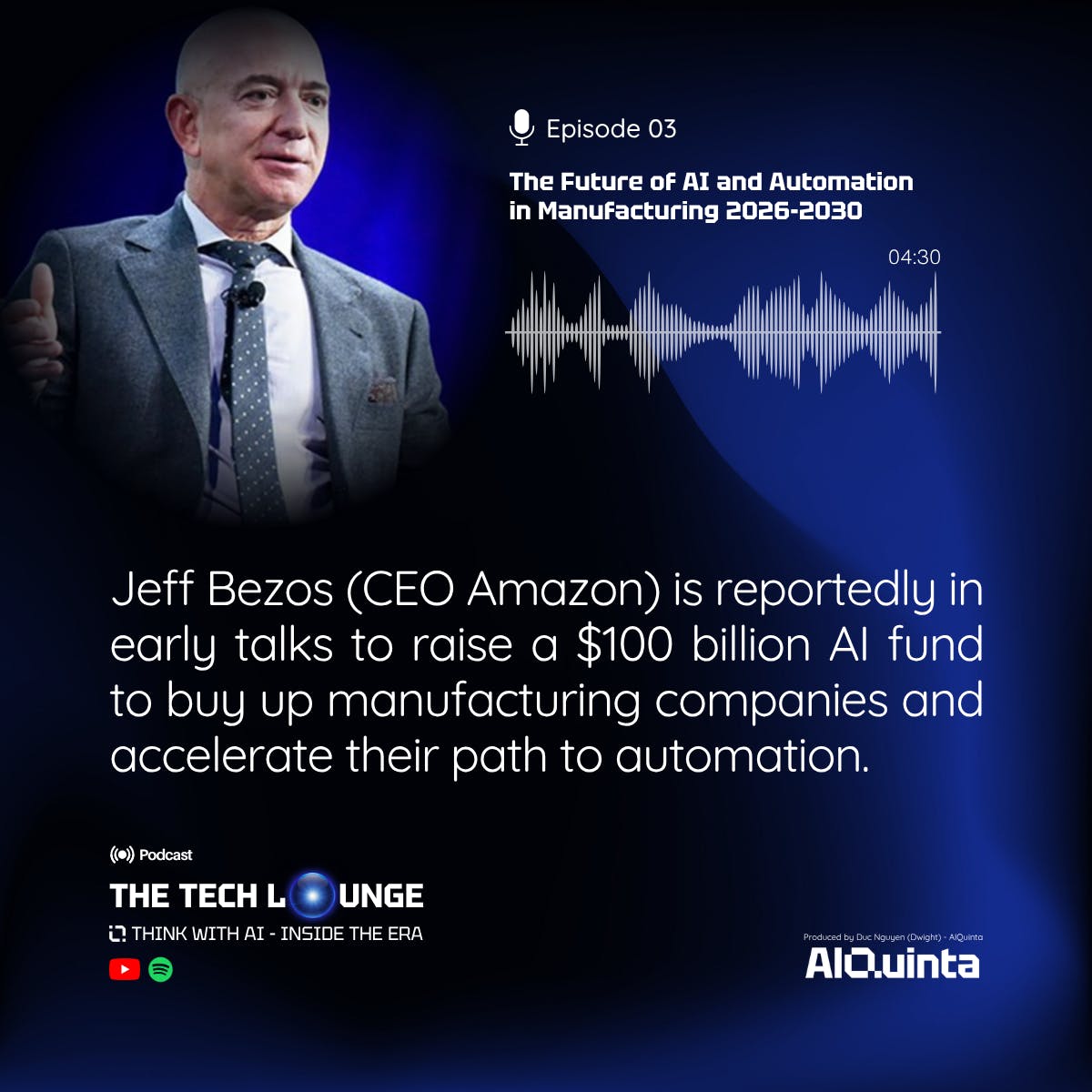 "Jeff Bezos (CEO Amazon) is reportedly in early talks to raise a $100 billion AI fund to buy up manufacturing companies and accelerate their path to automation."