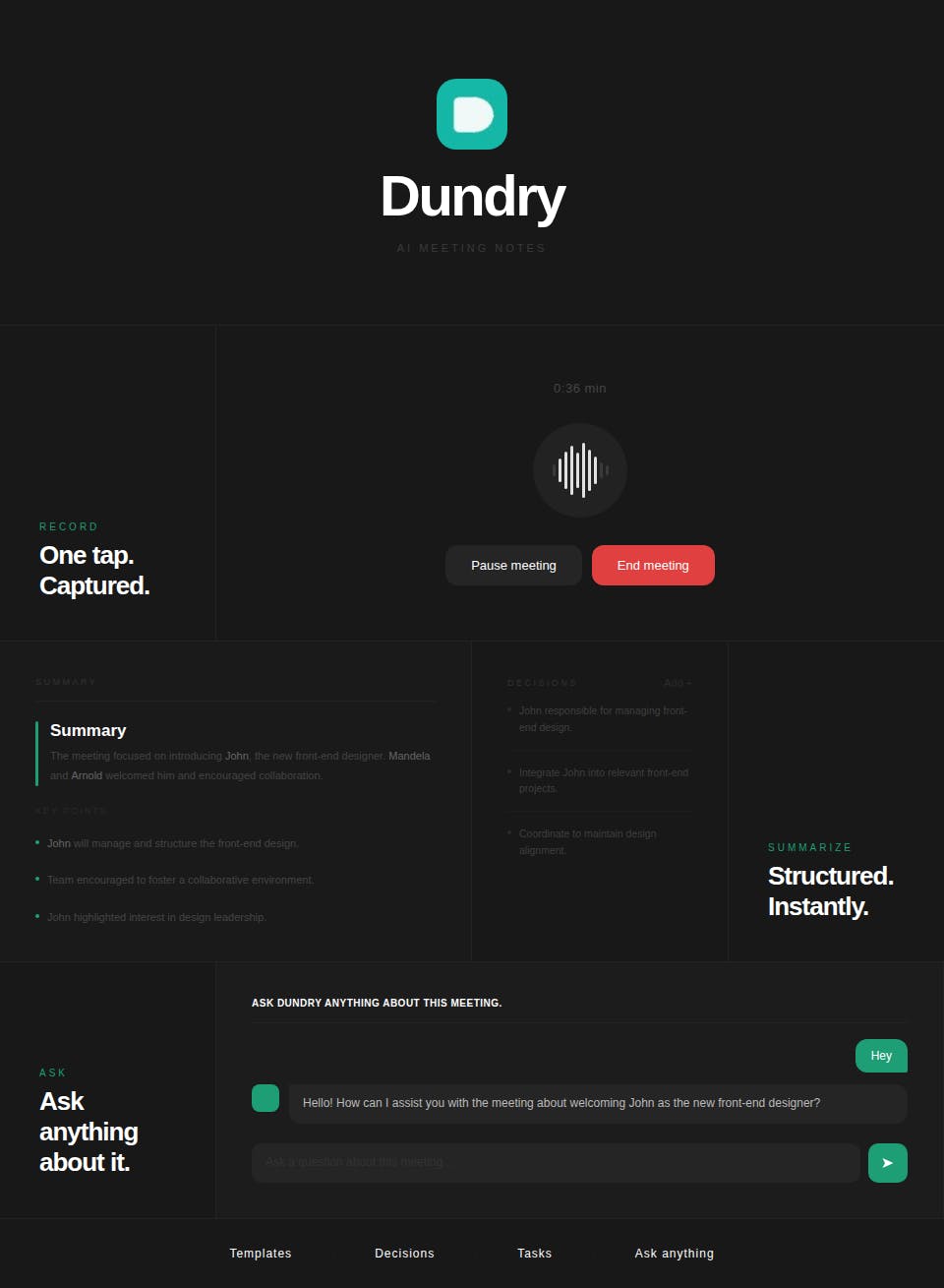 A meeting application called Dundry AI, made for teams and individuals to help preventing spending time on note everything happening around. Dundry is concluding everything after your needs, sorting your tasks, decisions and making it possible for you or your team to not needing to lift a pen and paper.