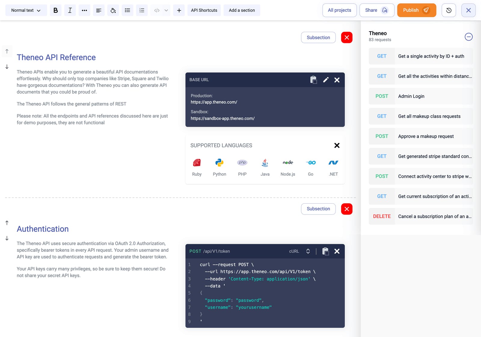 Theneo helps you create Stripe-like docs for your APIs.