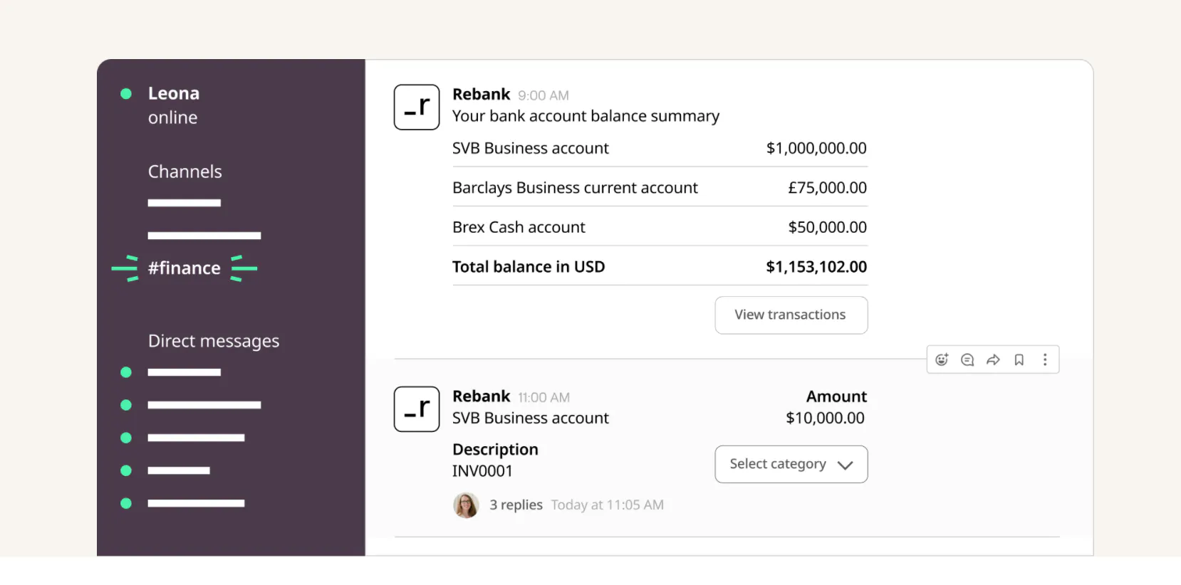 Rebank lets you see your company’s banking activity, including transactions and balances, in a private Slack channel.