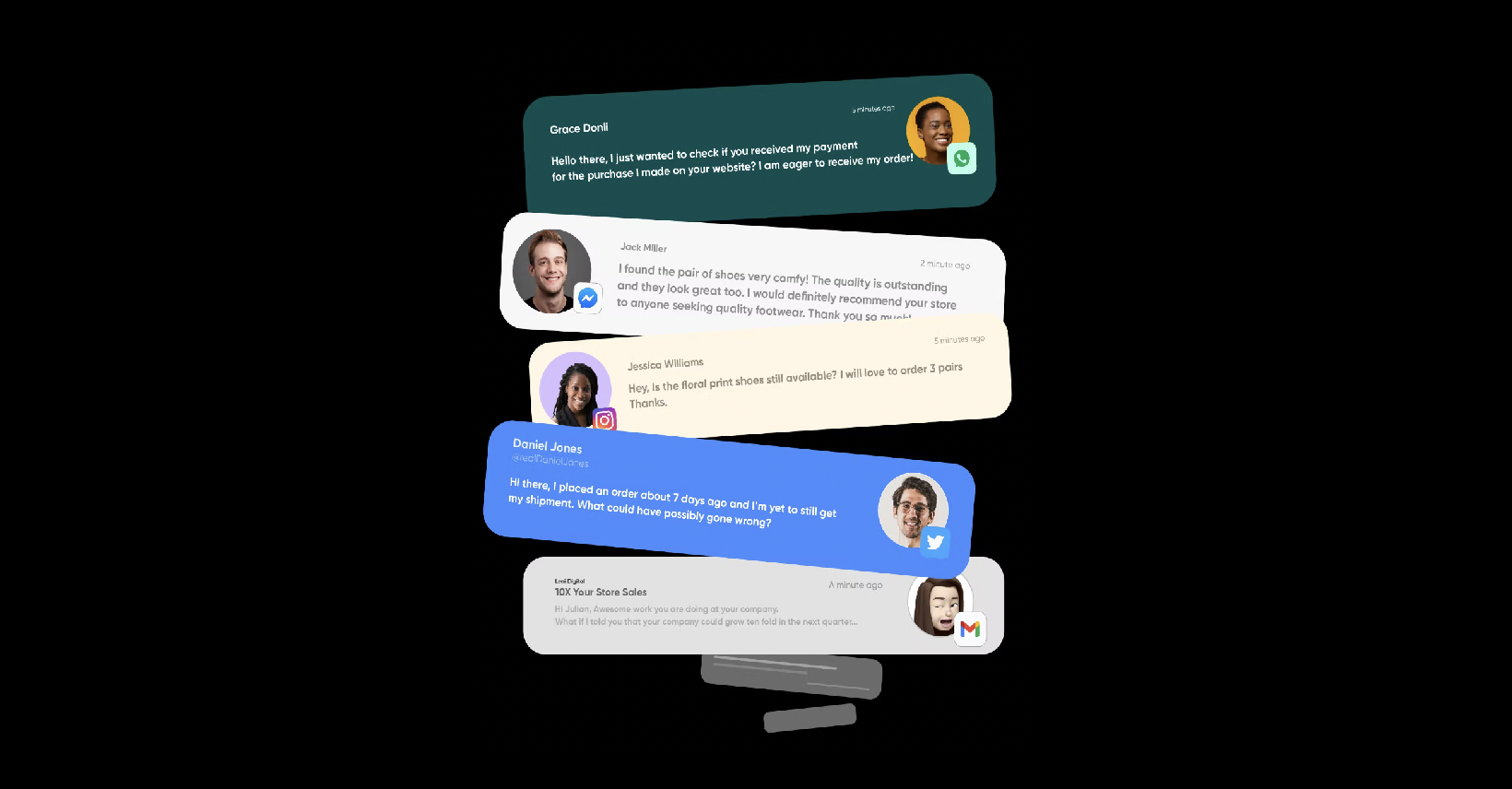 Simpu brings all of your channels like emails, WhatsApp, Twitter DMs, Facebook Messenger, SMS, and website live chat into one place.