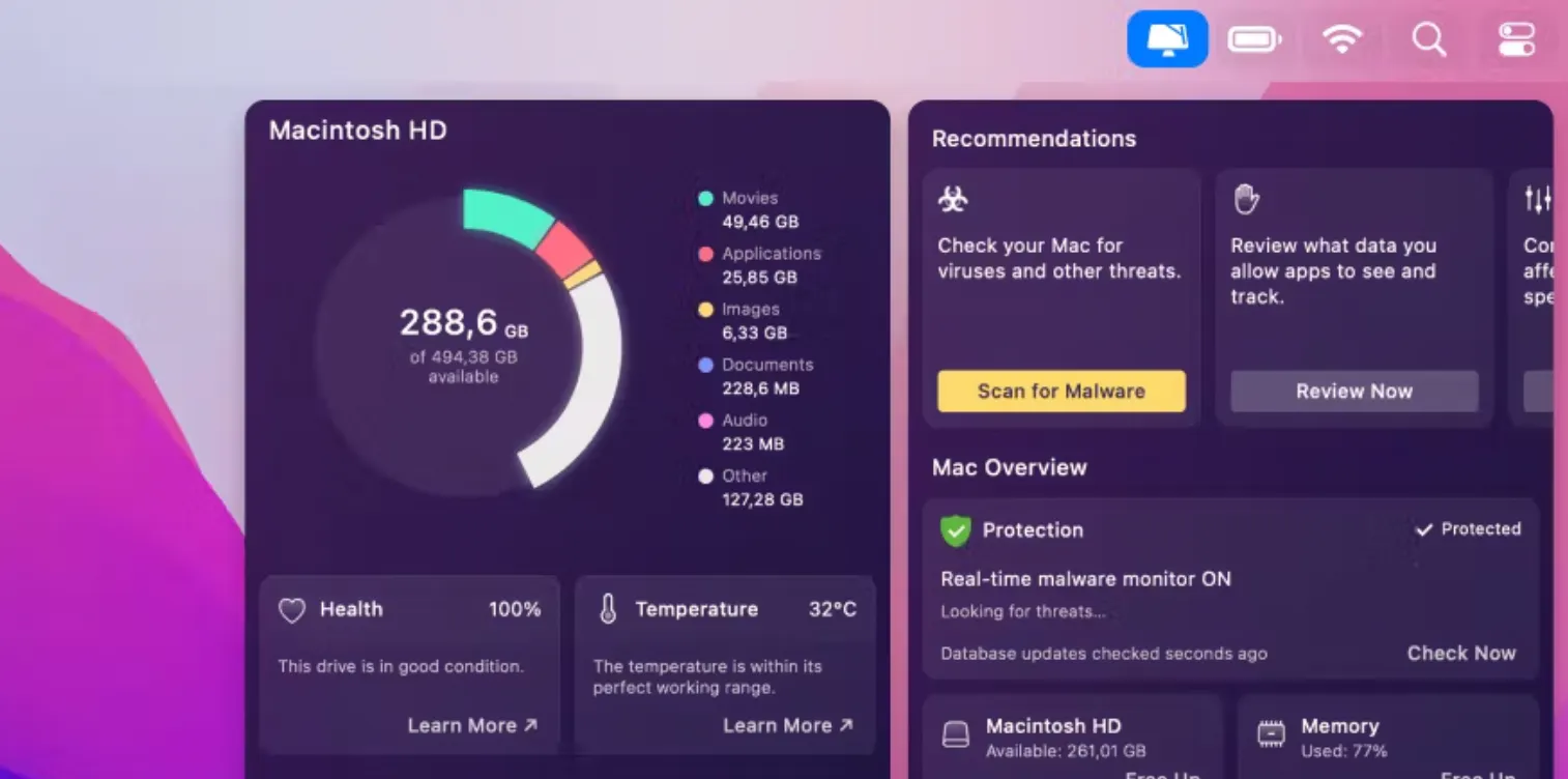 The MacPaw team launched an all-new CleanMyMac X Menu App to increase the longevity of your Mac with the help of five detailed health monitors: storage, state of protection, CPU performance, RAM, and battery.