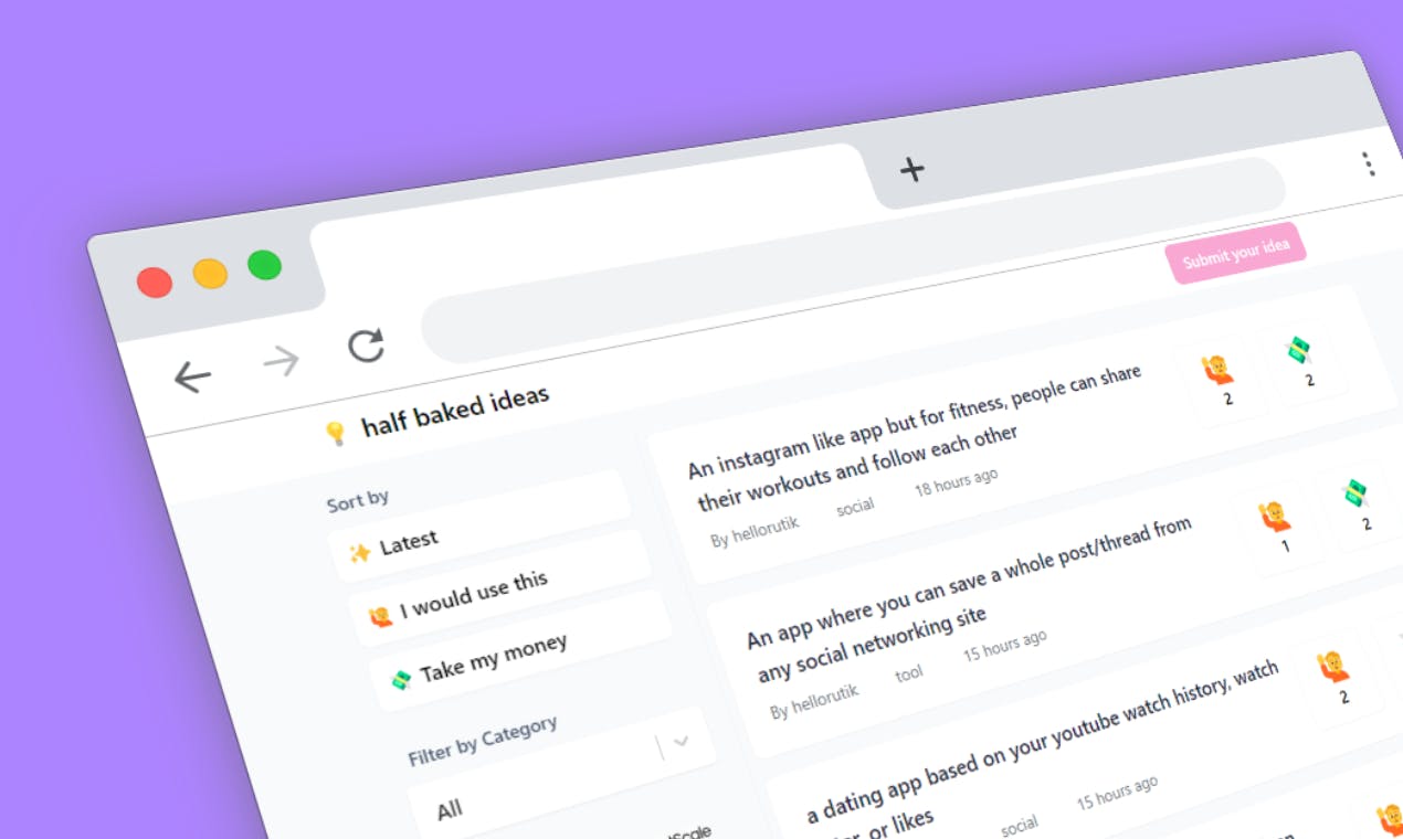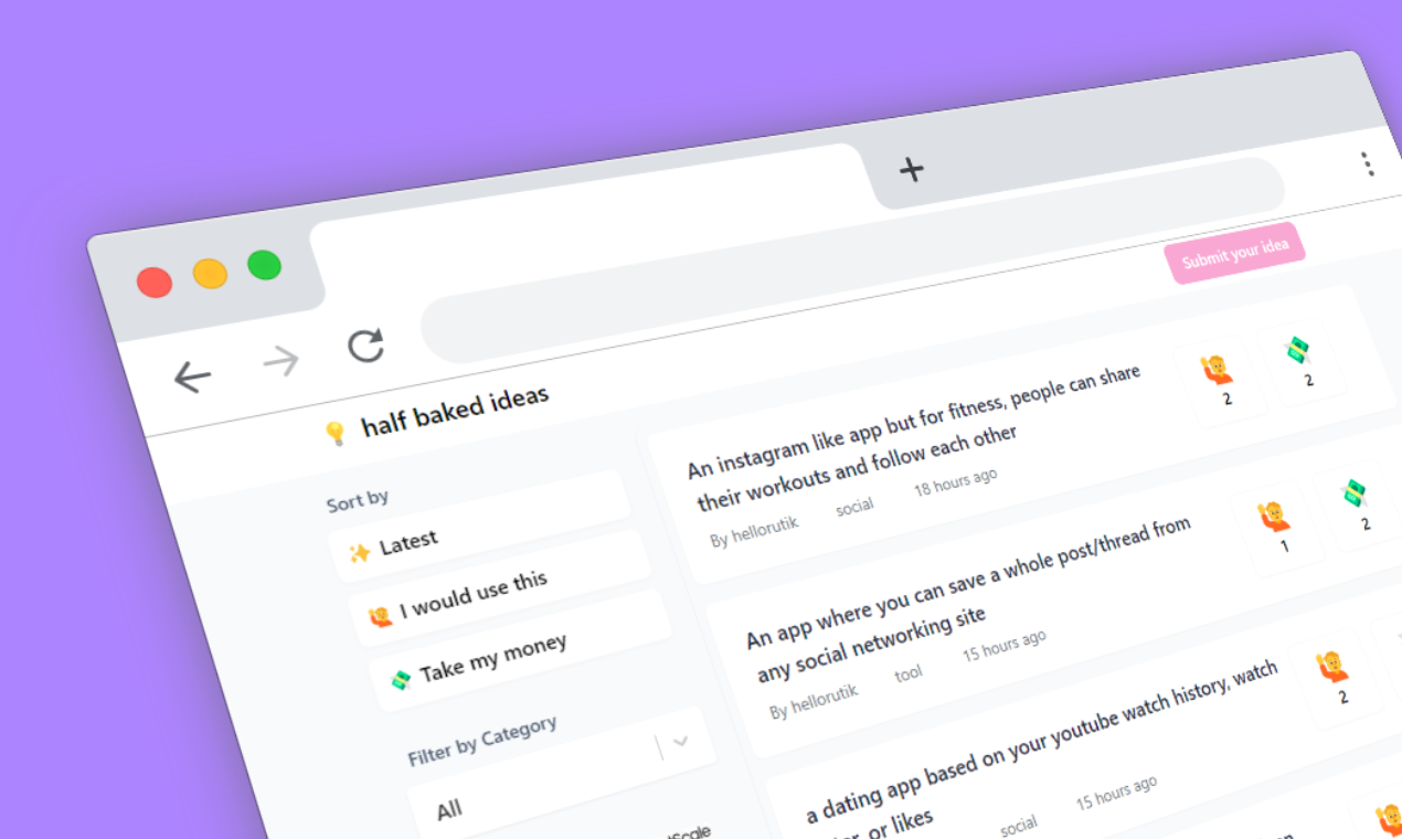 Half baked ideas is an open platform to share your"what if there was an app that could" ideas. You can submit your own and vote for the ones you like.