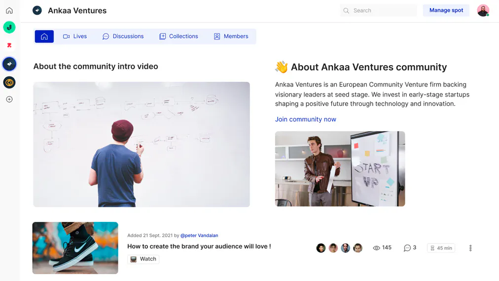 Build your community with MeltingSpot, a community platform with a built-in video studio, discussion channels, content libraries, and more.