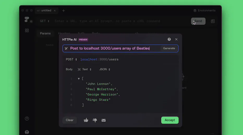 HTTPie uses AI to help you interact with APIs. You can describe a request using natural language (like âFetch last release details of httpie/desktopâ), and HTTPie generates the request that you can then save and use. You can also ask the AI to generate an HTTP request by describing its low-level components like the URL, headers, and body.Â