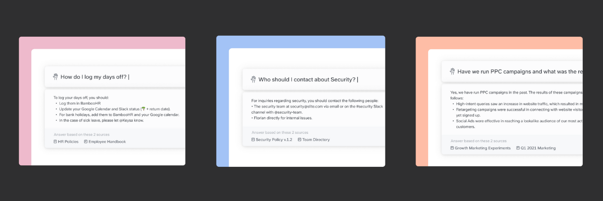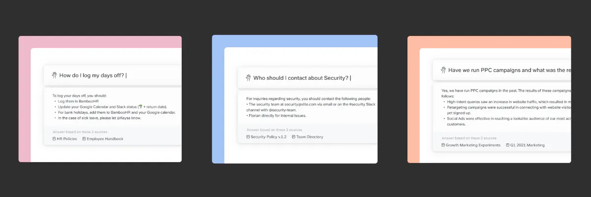 - Ask by Slite answers questions based on existing team documentation to streamline finding information and onboarding.
