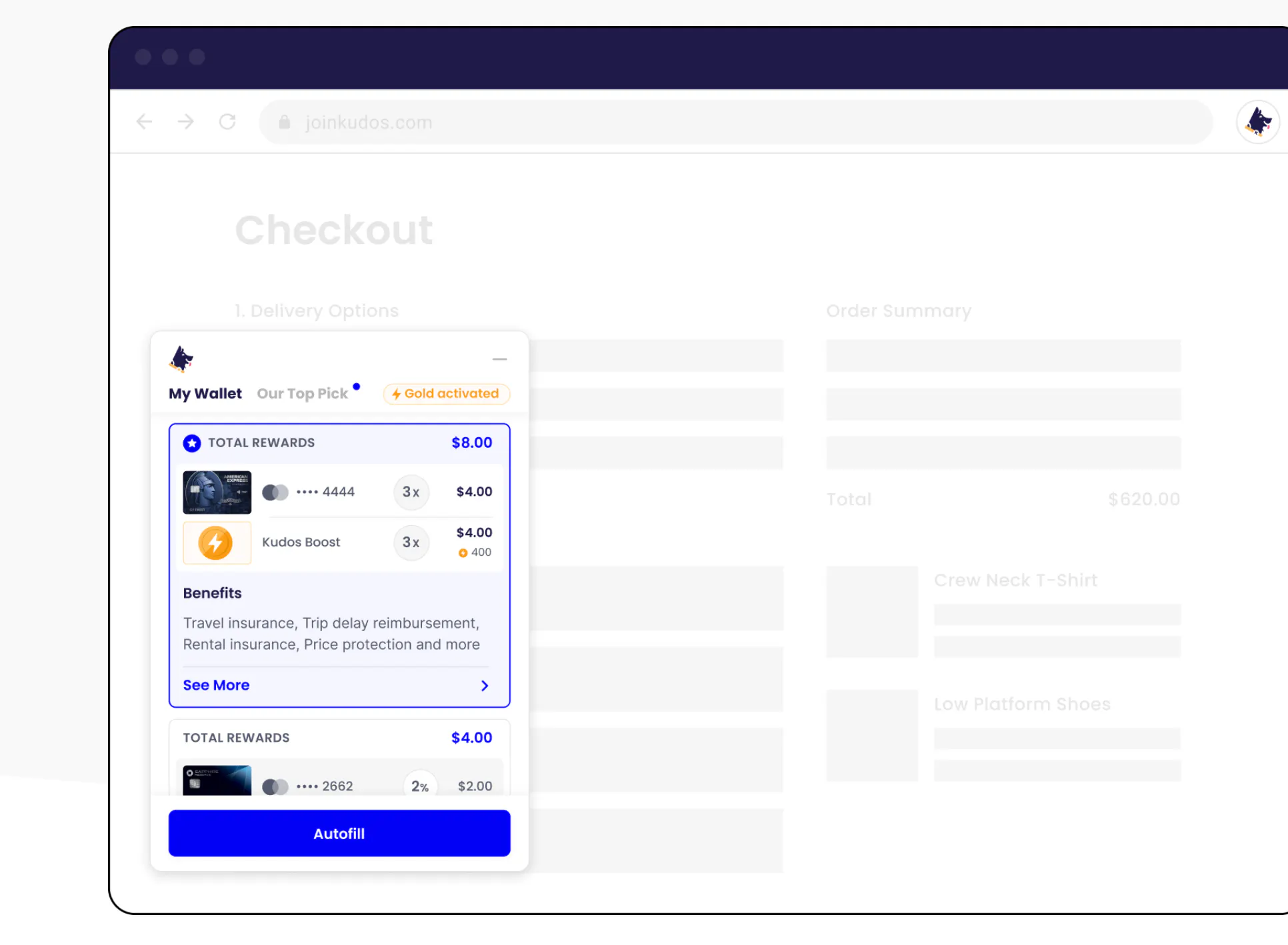 - Kudos is a free shopping extension that helps you pick the best card at checkout on over 2 million sites and doubles rewards across 15,000 partners.