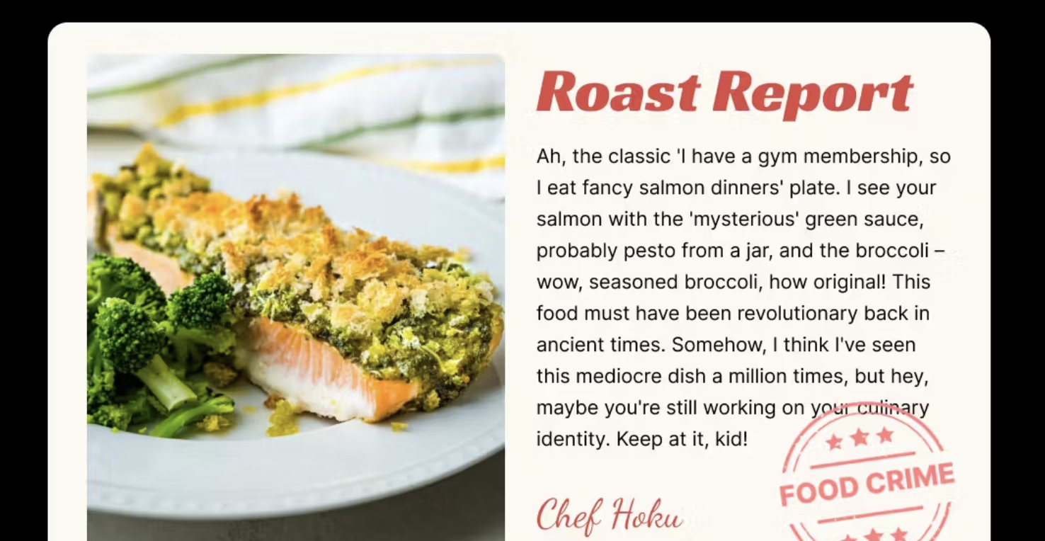- Roast My Meal by Hoku lets users upload a photo of theiryour food and get roasted by “a savage AI.”