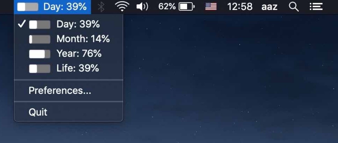 Progress Bar OSX shows you the exact percentage of how much the day, month, year and your life has progressed in your OSX menu bar ⏳