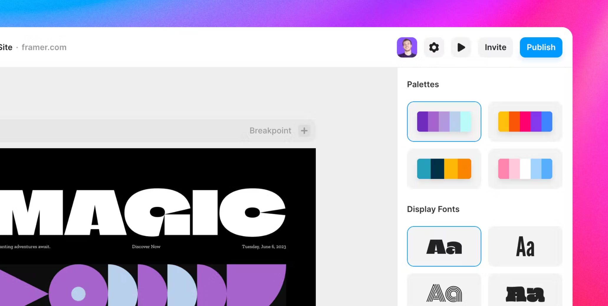 Framer handles everything about your site, from responsiveness and animations to technical things like CMS. It powers products like a portfolio design service, an authentication tool, and even an animation platform.Ā