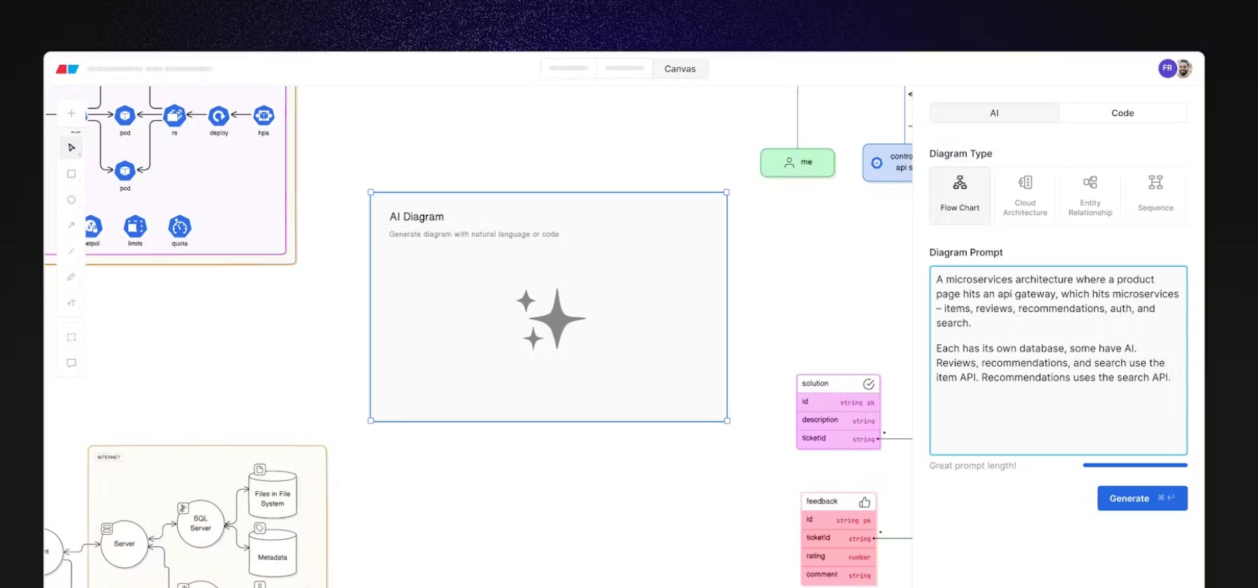 Say youāre building a cloud infrastructure and you want to visually explain your thought process to your team. Instead of spending hours designing a diagram, you can instead tell Eraser what you need and it will get to work generating colorful, accurate, and icon-studded diagrams to your taste.Ā