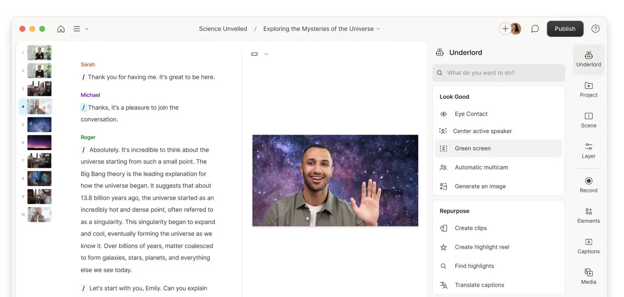 Composition: Underlord automatically addresses composition issues. It ensures eye contact, centers the speaker, and generates images to display alongside the video. Additionally, it adds multicam angles where needed to enhance the visual experience.