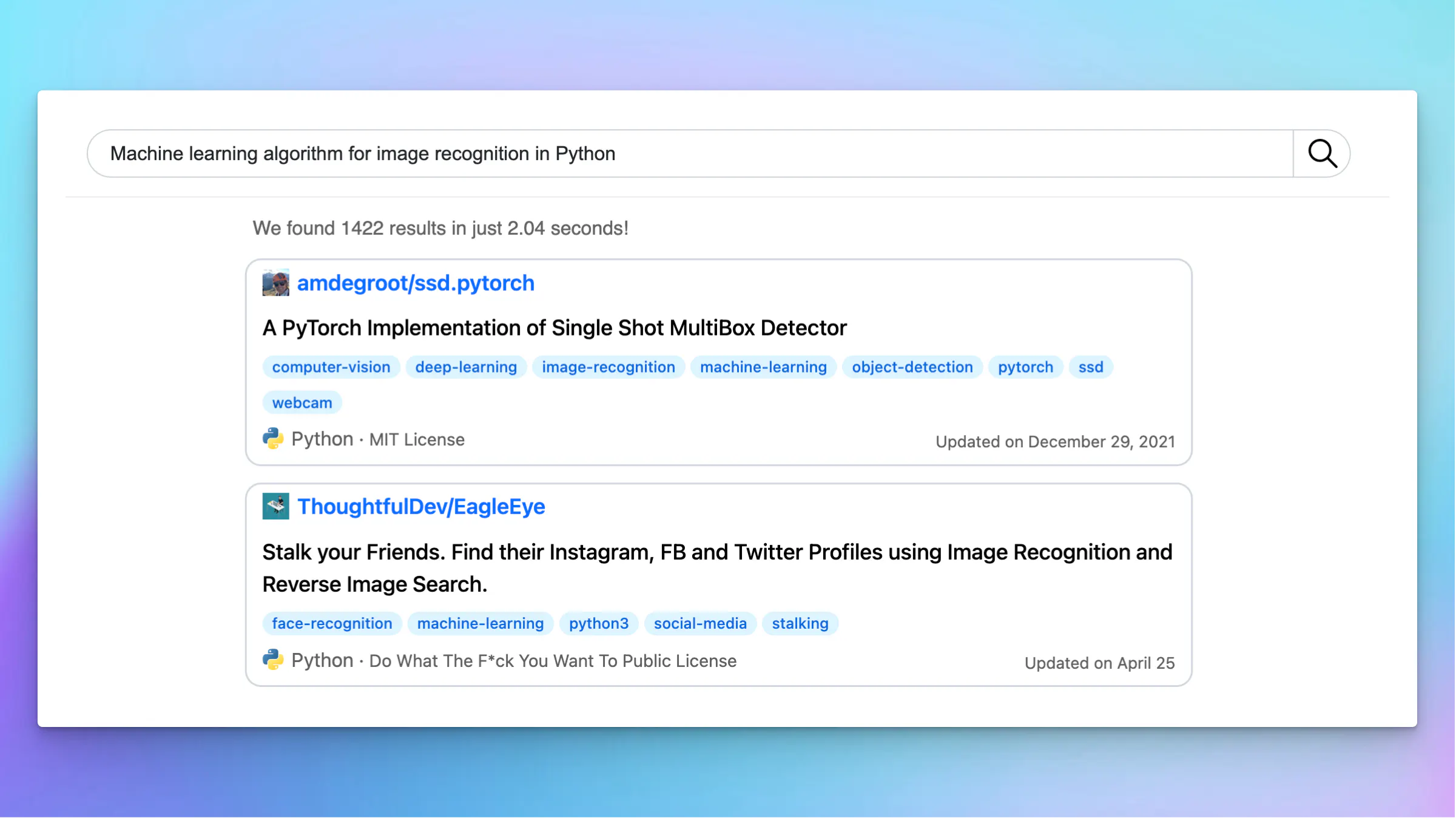Code Finder lets you search for GitHub Repositories with natural language.Ā