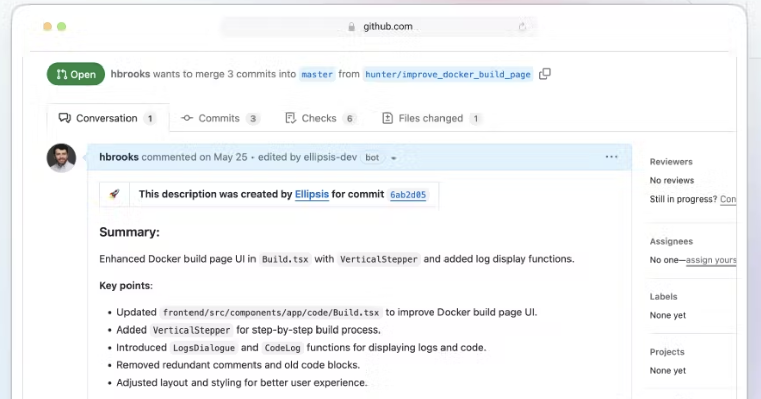 Ellipsis is a YC-backed AI tool that automates bug detection and squashing. It runs as a GitHub bot that automatically performs deep, LLM-powered code reviews, fills in PR descriptions, and can even fix bugs. Once you open a pull request, you will get an AI Code Review. As you write code, Ellipsis will update the summary and review any changes. If a bug pops up, you can squash it with a single click.
