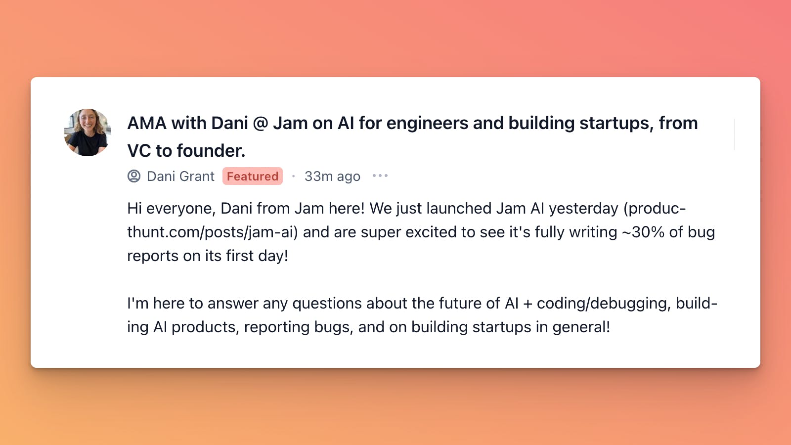 Dani Grant, founder of Jam, is hosting an AMA on AI for engineers, debugging, and startup building. Fresh off the launch of Jam AIâwhich is already writing ~30% of bug reportsâsheâs answering questions on AI-driven coding, bug reporting, and the founder journey from VC to startup.