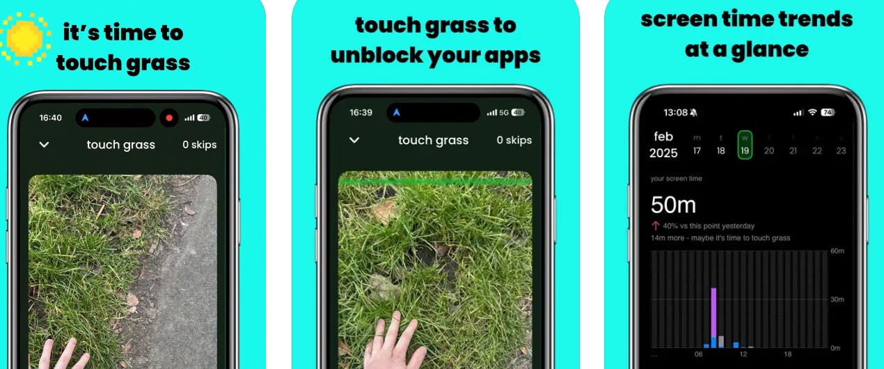 Touch Grass is an app that blocks your phone until you literally step outside. Using AI to verify real grass, it forces you to put the phone down, touch some greenery, and earn your screen time back. No shortcuts, no cheating, just go outside.