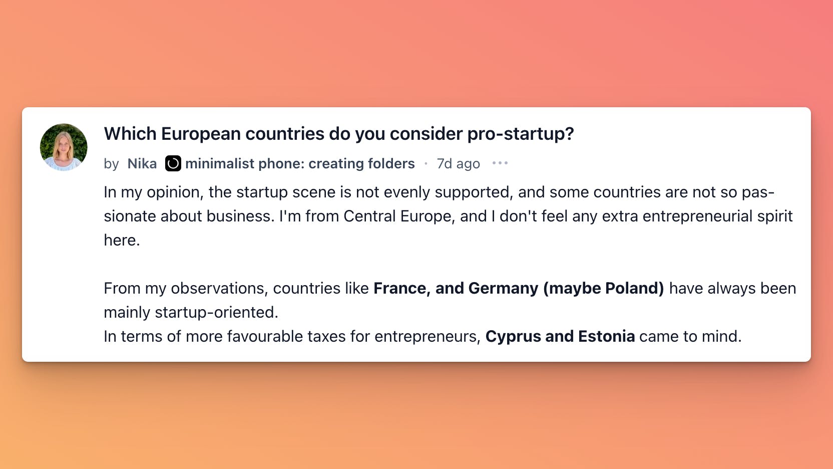 Europe loves to say itās an innovation hub, but if youāve ever tried to start a company there, you know the real challenge isnāt funding, itās surviving the bureaucratic boss fight. Nika started a discussion on which European countries actually make life easier for founders, and the answers hit all the usual memes.