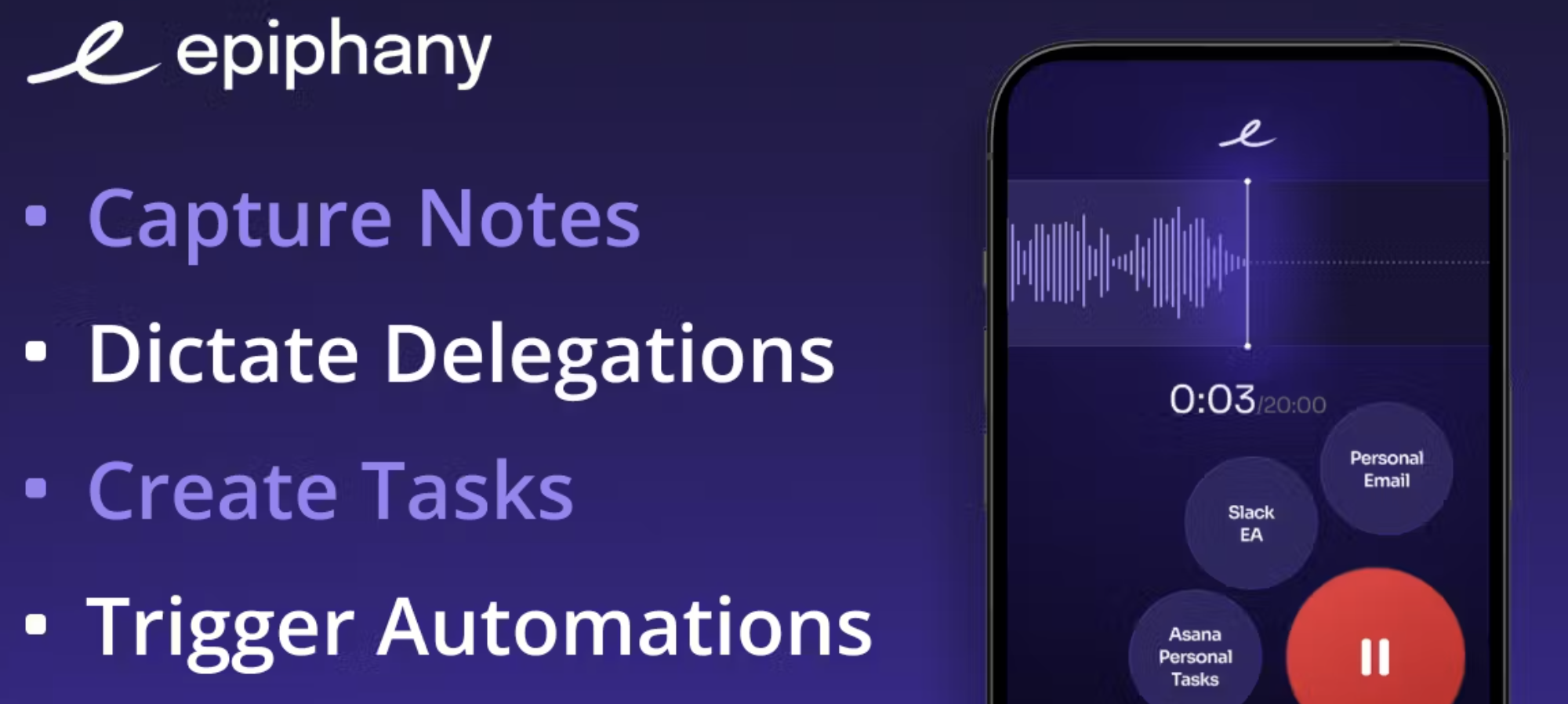Epiphany is a voice-to-action tool that lets you speak an idea and instantly turn it into a task, note, or reminder inside tools like Notion, Asana, Todoist, ClickUp, and Obsidian. Instead of letting ideas slip away, it captures them in the moment and drops them exactly where they need to go.