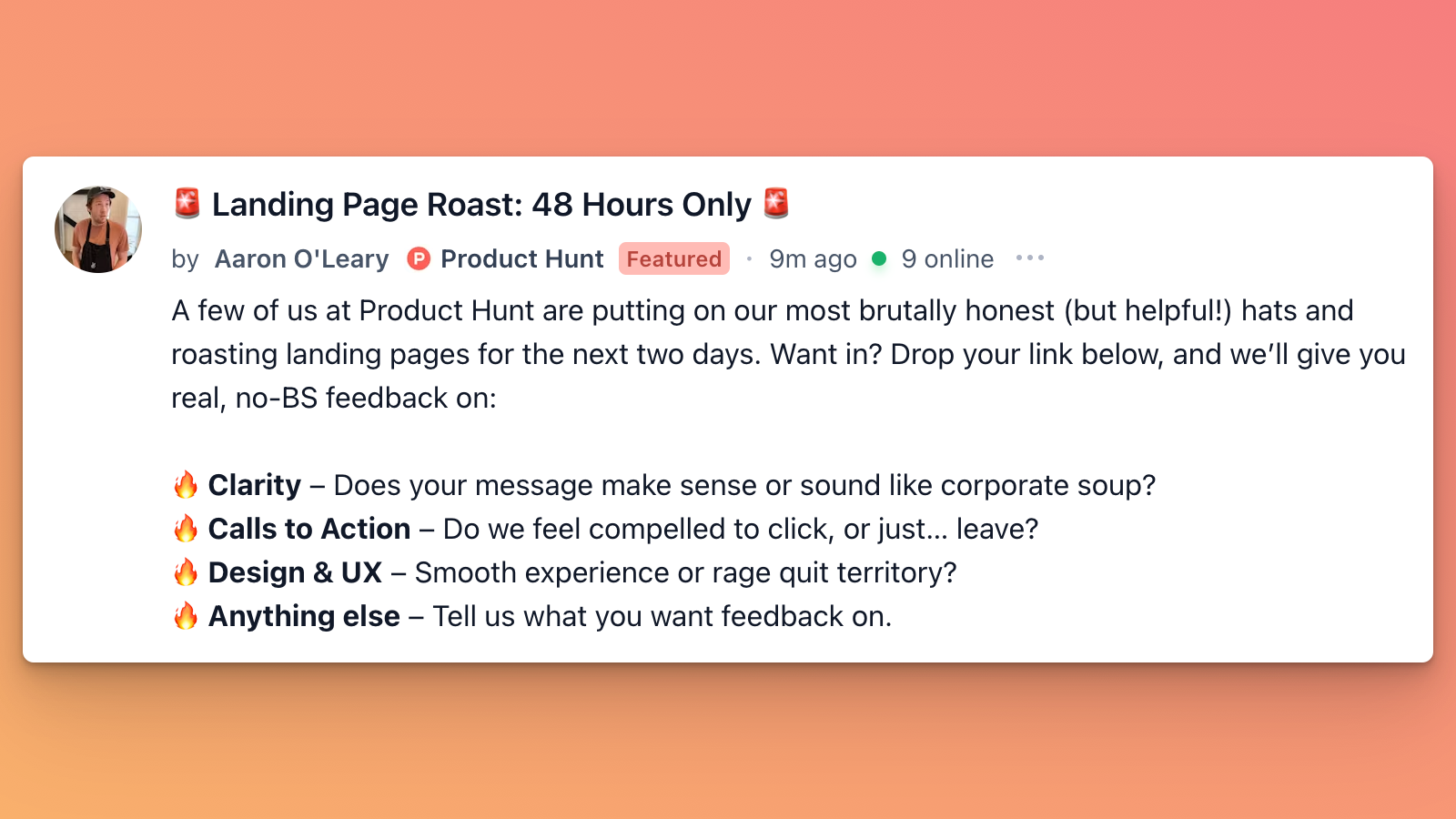 The Product Hunt team is running a 48-hour landing page roast, giving founders real, no-BS feedback on their sites. If you’ve ever wondered whether your landing page actually works or just looks nice, now’s your chance to find out.