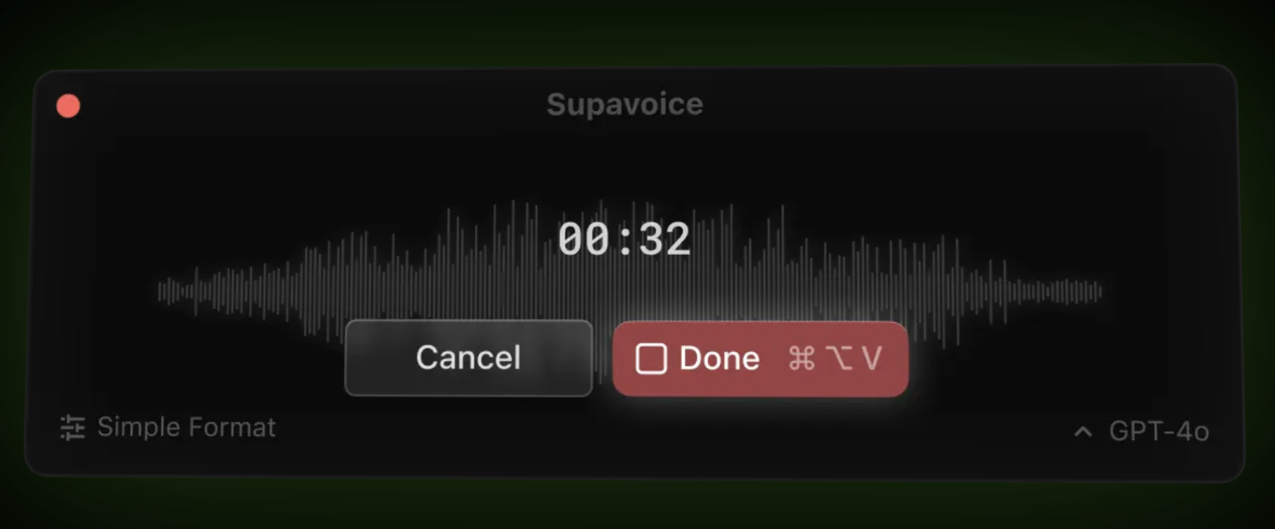 Supavoice is a Mac app that turns your speech into clean, formatted text in any application. It works with your OpenAI key, supports different formatting modes, runs locally, and doesn’t require a subscription.