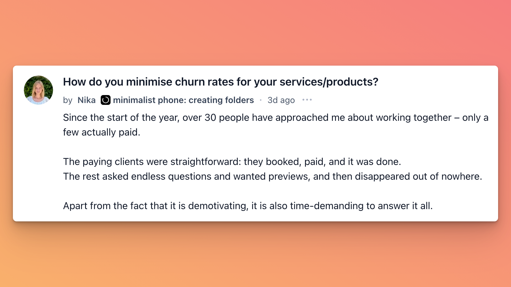Nika started a thread on minimizing churn, and the conversation quickly shifted to the pre-churners—the ones who never convert, drain your time, and vanish before the invoice.
