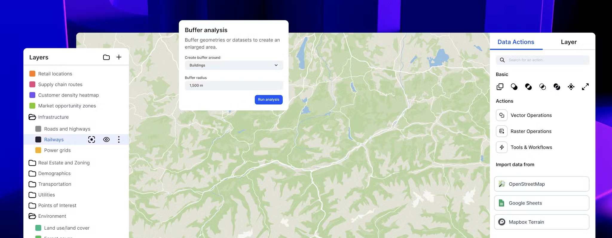 Atlas 2.0 is a browser-based platform for building and sharing spatial data apps—no GIS background required. Import geodata, analyze it, automate workflows, and turn it into something interactive and actually usable by your team or customers.
