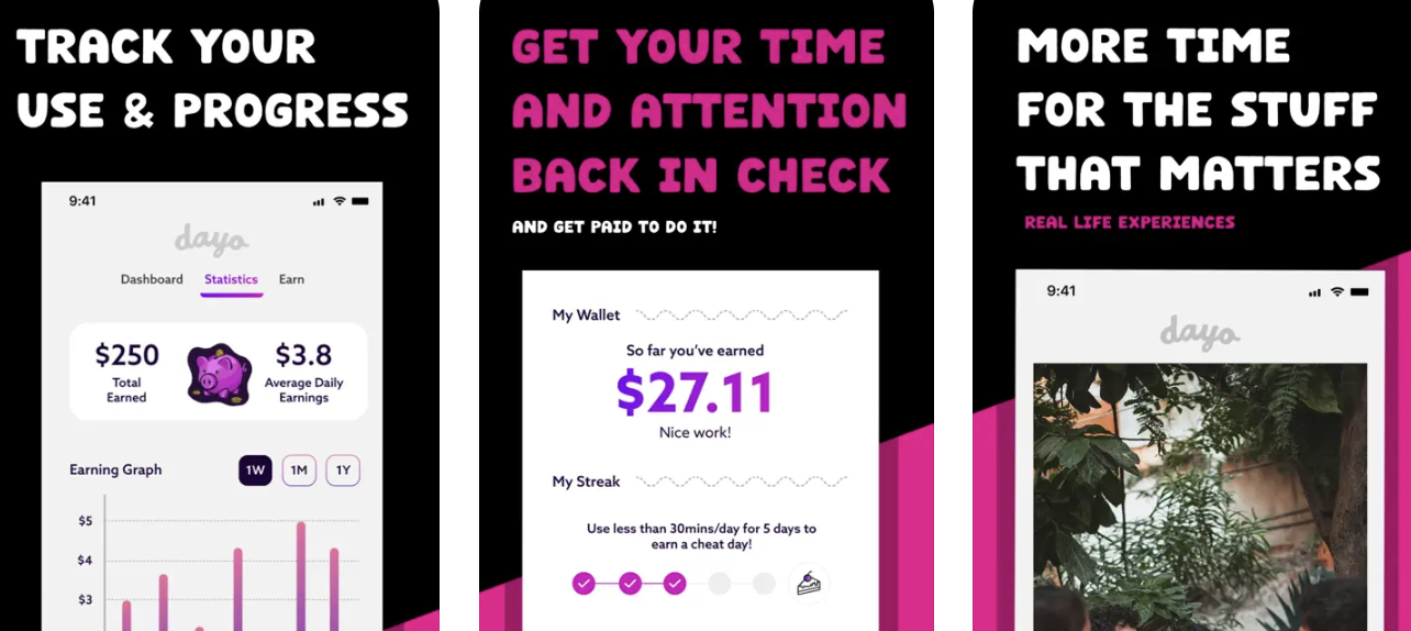 Dayo is a free app that pays you for using less social media. Keep your usage under 30 minutes a day and earn $5 in credits, which you can spend in its own marketplace of products and services.