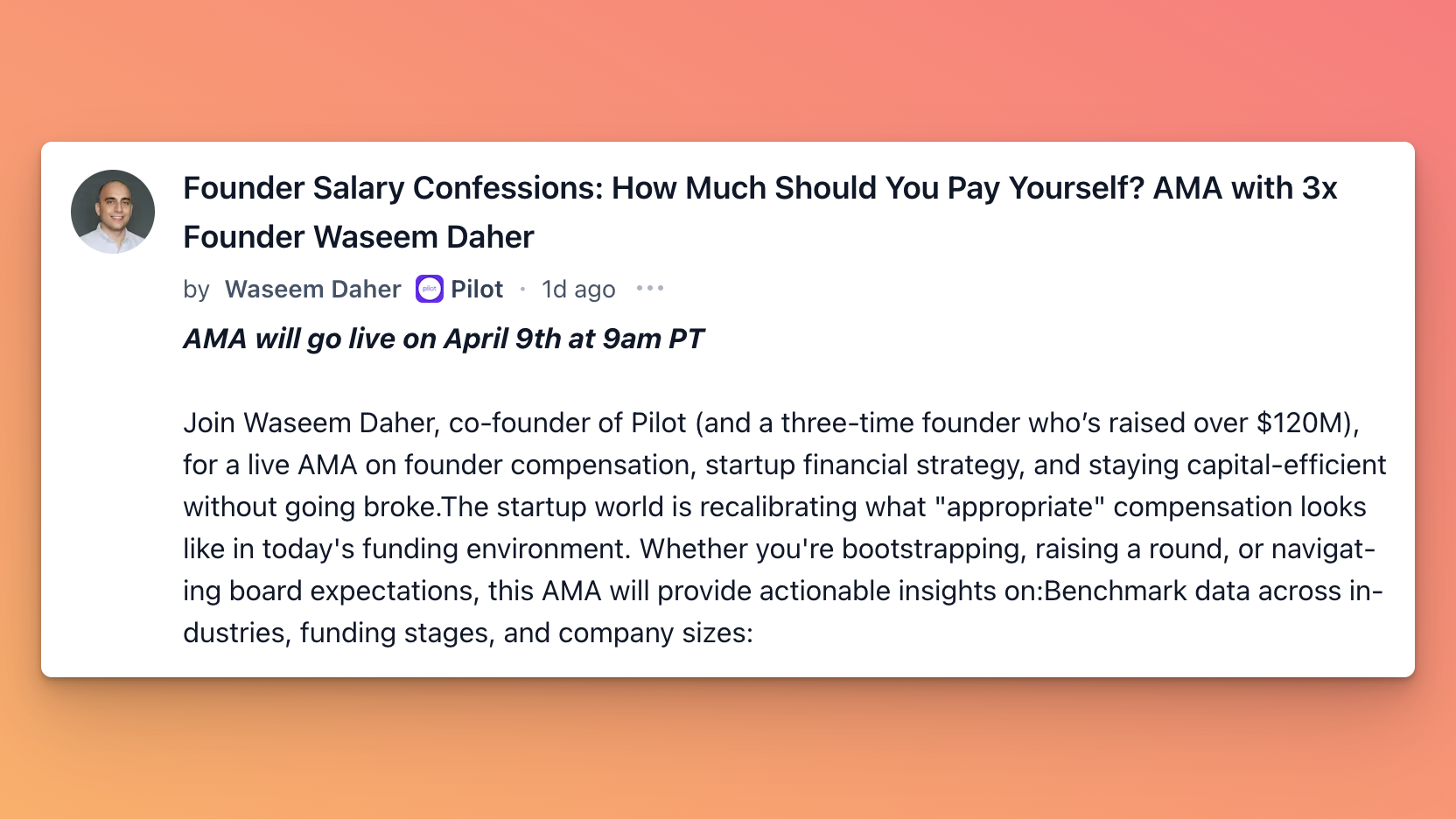 Itâs one of those questions no one wants to answer out loud but Waseem Daher (CEO of Pilot and three-time founder) is doing just that. In this AMA, he breaks down how to think about founder salaries across different stages, whatâs reasonable, and why underpaying yourself isnât always the smart move.