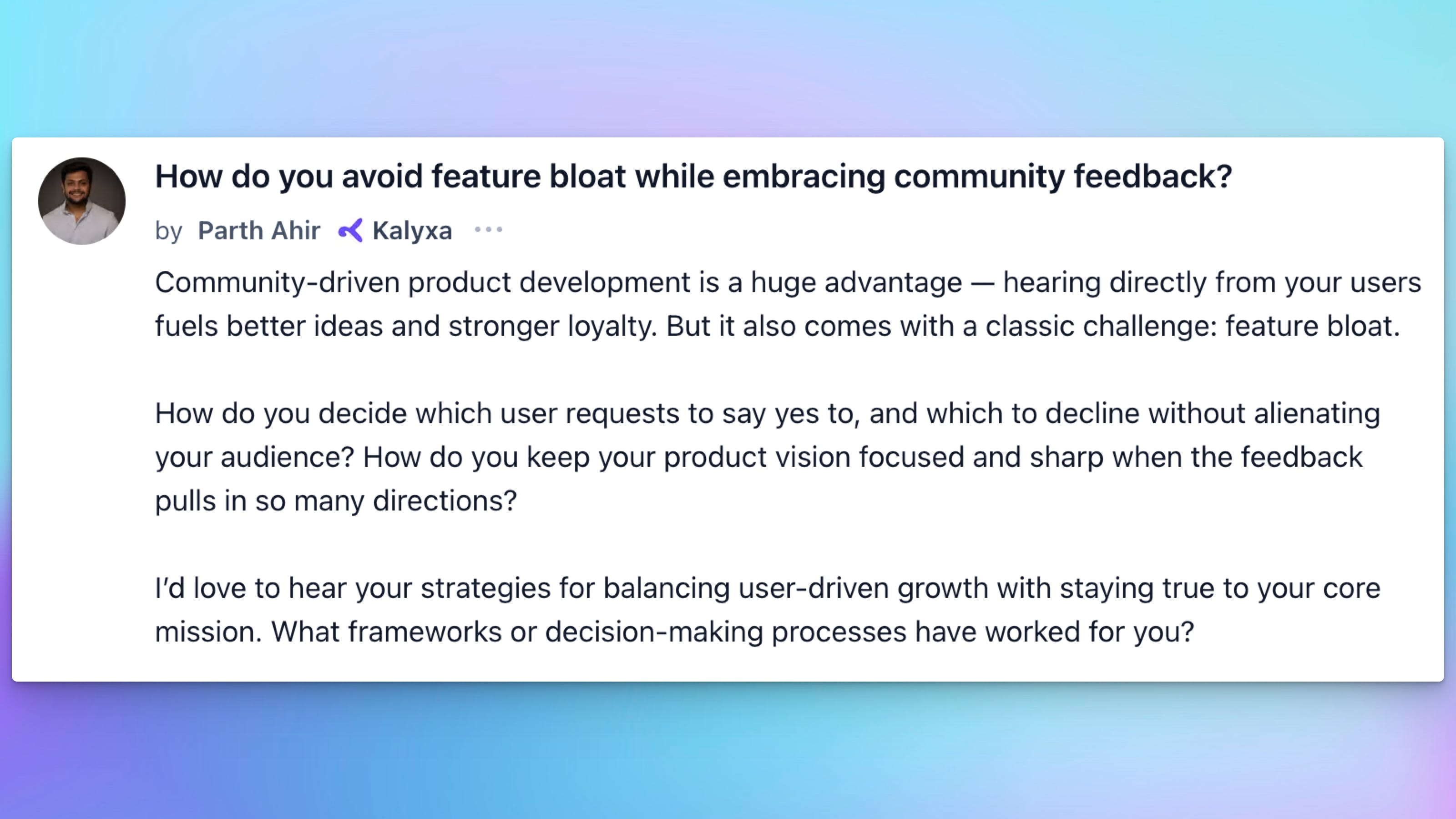Parth Ahir asked, “How do you avoid feature bloat while still listening to your users?”