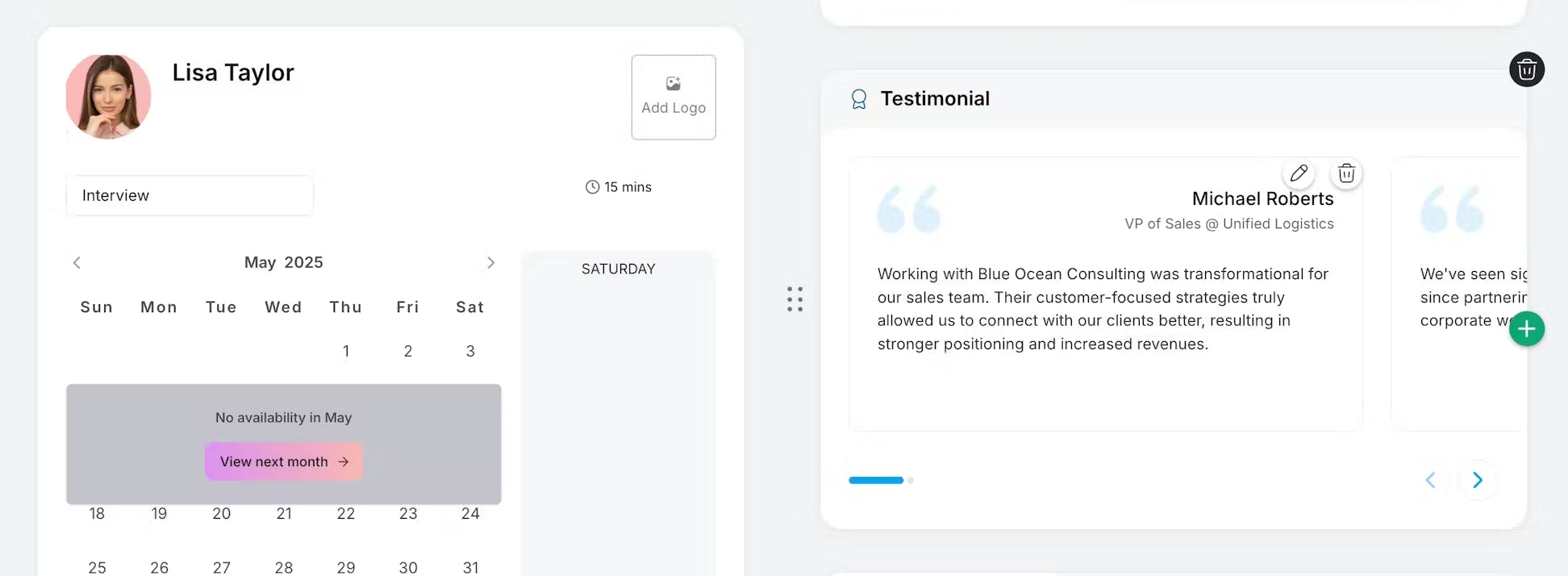 Lunacal turns your scheduling link into a custom landing page. Embed intro videos, testimonials, rate cards and FAQs, pick your own domain, and sync with Zoom or Teams so every click tells your story.
