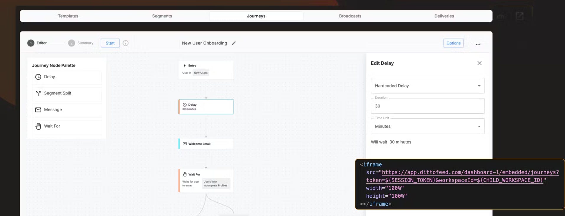 Dittofeed lets you embed full messaging features into your app in a few lines of code. Add template editors, automated journeys, user segments and broadcast tools across email, SMS, push, WhatsApp and Slack with an iframe or React widget.