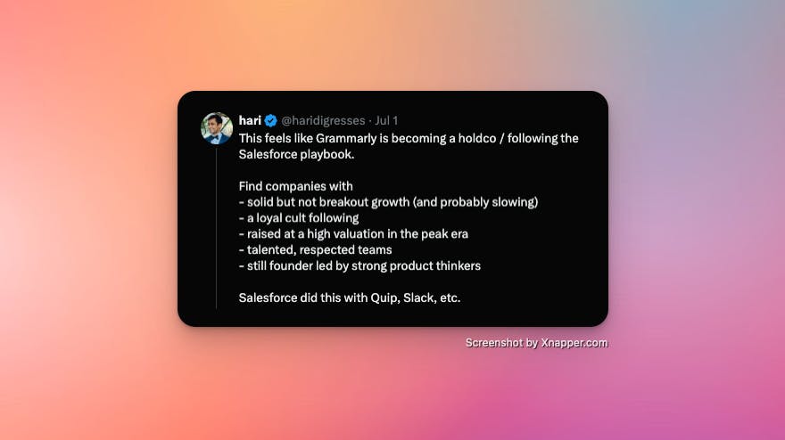 Superhuman got bought this week, this time by Grammarly. Although terms havenât been disclosed, weâre pretty sure the price was worth it. Grammarly gets a solid team thatâs more interested in shipping features than spinning out their personal brands. It wins a hardcore group of followers that will âK all day long. And it obtains another tool that, like it, was using AI before AI was everywhere.