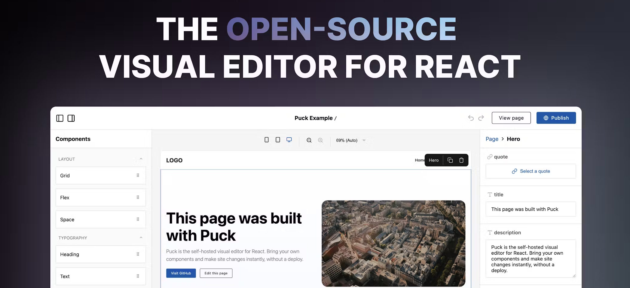 Puck drops a visual editor inside your React app. Drag blocks made from your own components, let teammates ship pages without touching code, and save content as plain JSON wherever you want. No lock in, no mystery widgets, no export drama.