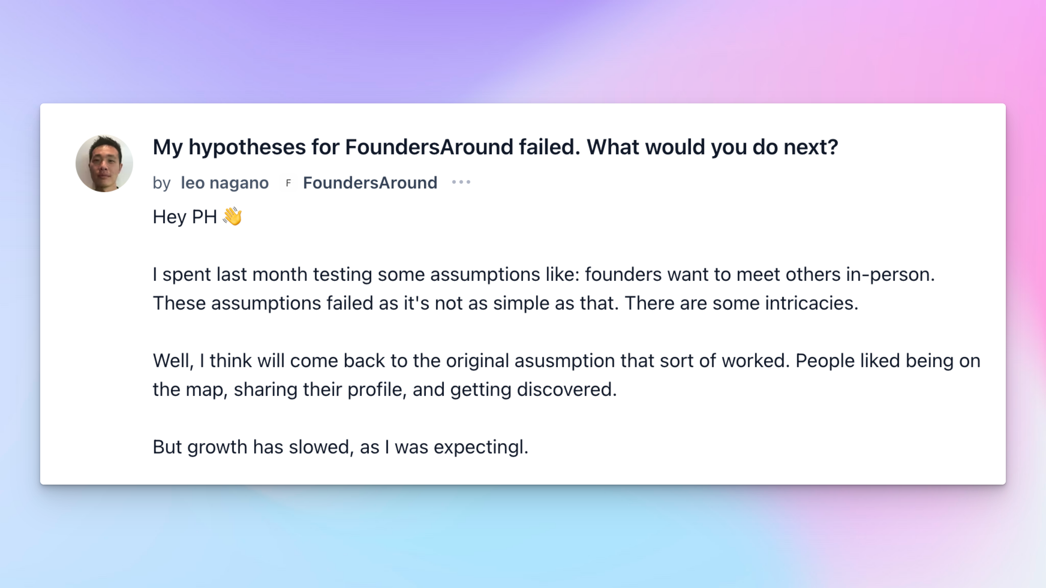 Leo tried to build FoundersAround around in-person meetups. That flopped. What people actually liked was the public map and profiles. Growth cooled, so he’s picking a path: keep it founder-first and sharpen discovery, or add companies and go full startup atlas. He’s hunting for growth moves that aren’t spammy. Got one worth testing?