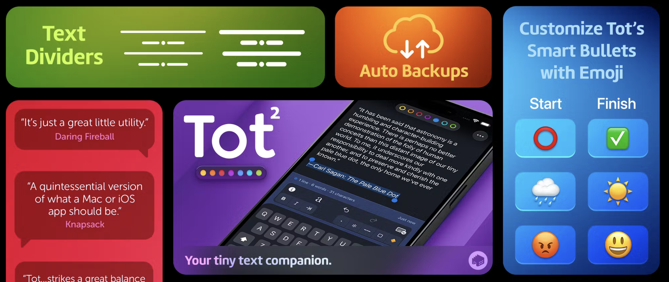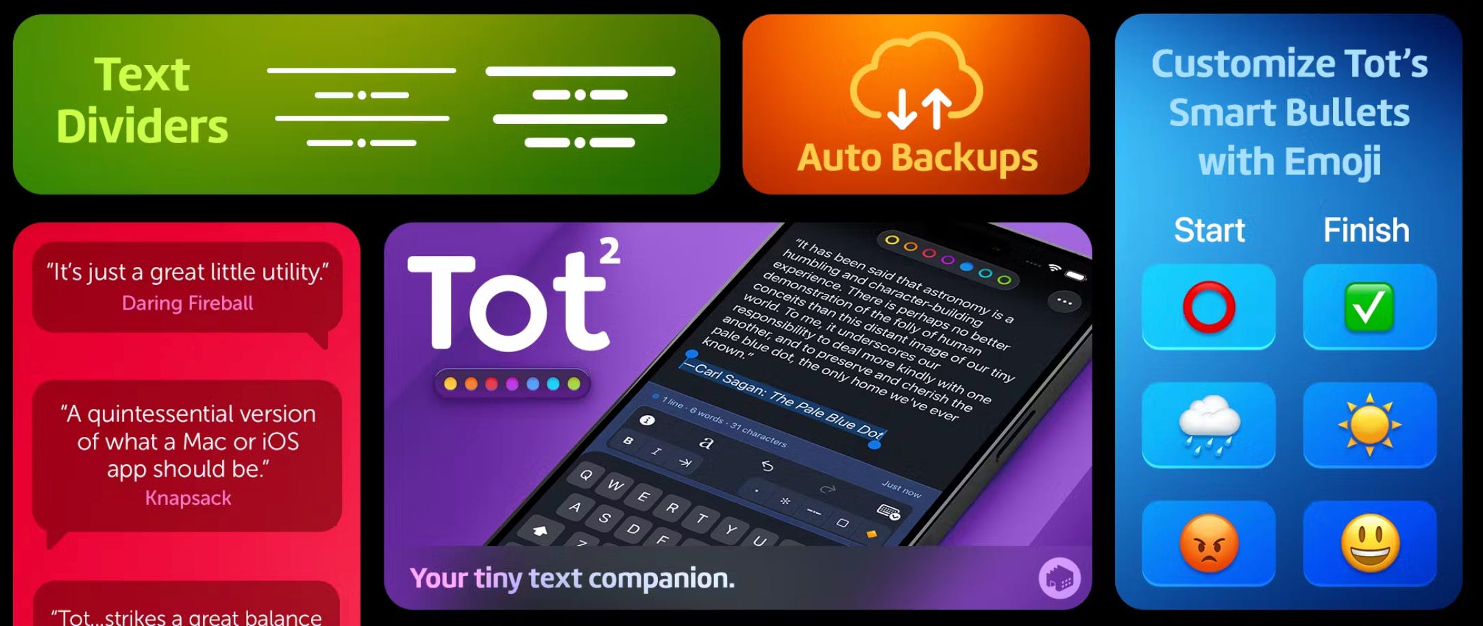 Tot 2.0 is a tiny text companion for Mac, iPhone, iPad, and Watch. You still get seven color-coded notes that sync with iCloud, now with smart bullets, automatic indents, text dividers, a refreshed UI, and automatic iOS backups so quick lists and drafts stay tidy and safe.