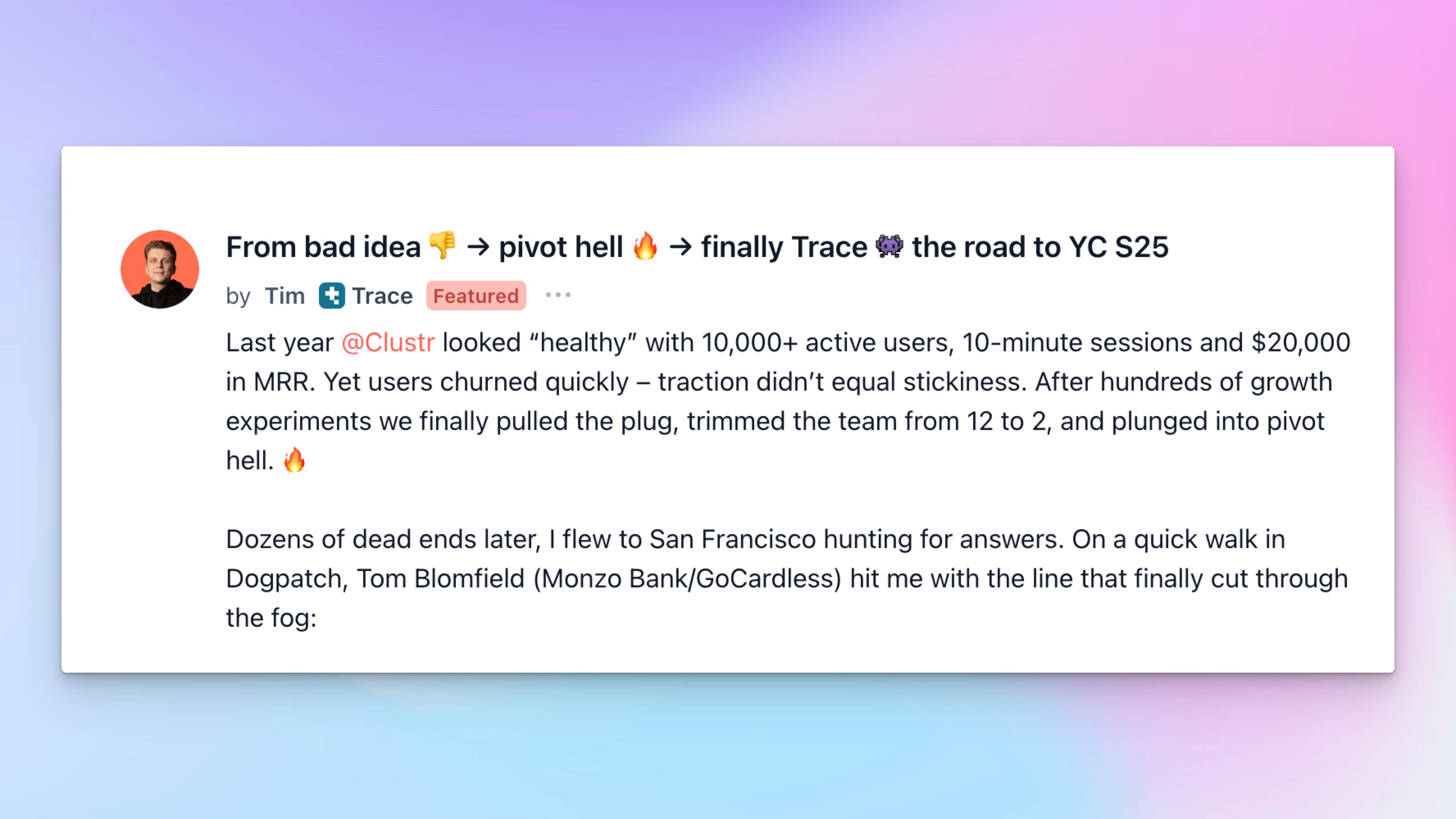 Clustr looked fine on paper with solid metrics, but users did not care. He cut the team from 12 to 2, wandered through pivot hell, then a walk with Tom Blomfield flipped the switch to move fast. Two weeks later he had 54 expert interviews, first code out, and three pilots signed. That became Trace. They sprinted to the YC S25 deadline and got the yes. Takeaway: kill zombie ideas early, talk to users every day, keep the team small and decisive, ship while you learn.