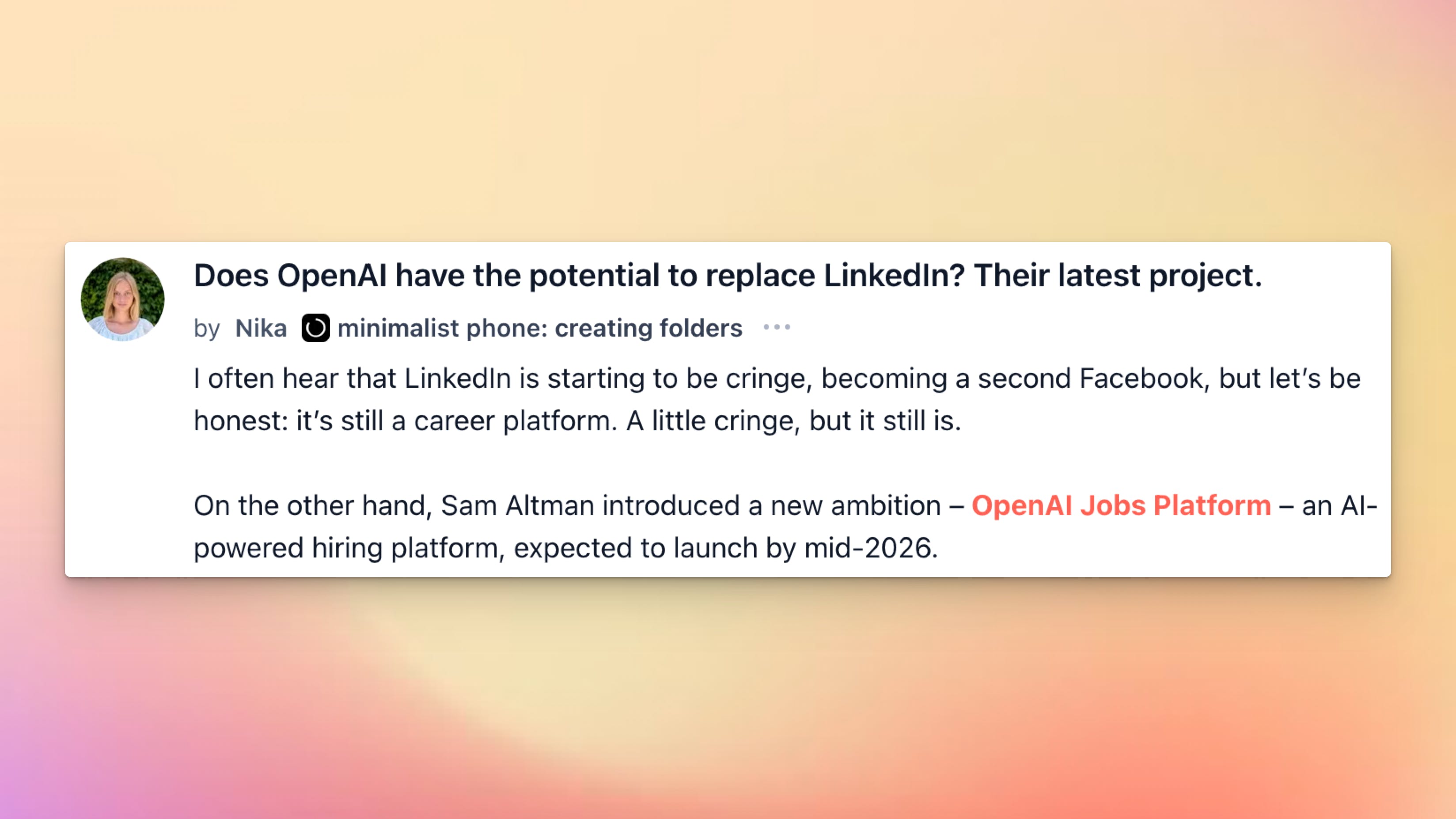 Nika asks whether OpenAI’s latest project could be the thing that finally dethrones LinkedIn. Some say yes: an AI-powered platform that matches talent to jobs and verifies skills could strip out the noise and make hiring faster. Others argue LinkedIn is more than a job board. It’s a place where people build identity, post content, and keep weak ties alive between roles. The question is whether the future of work will be transactional or still built on relationships.