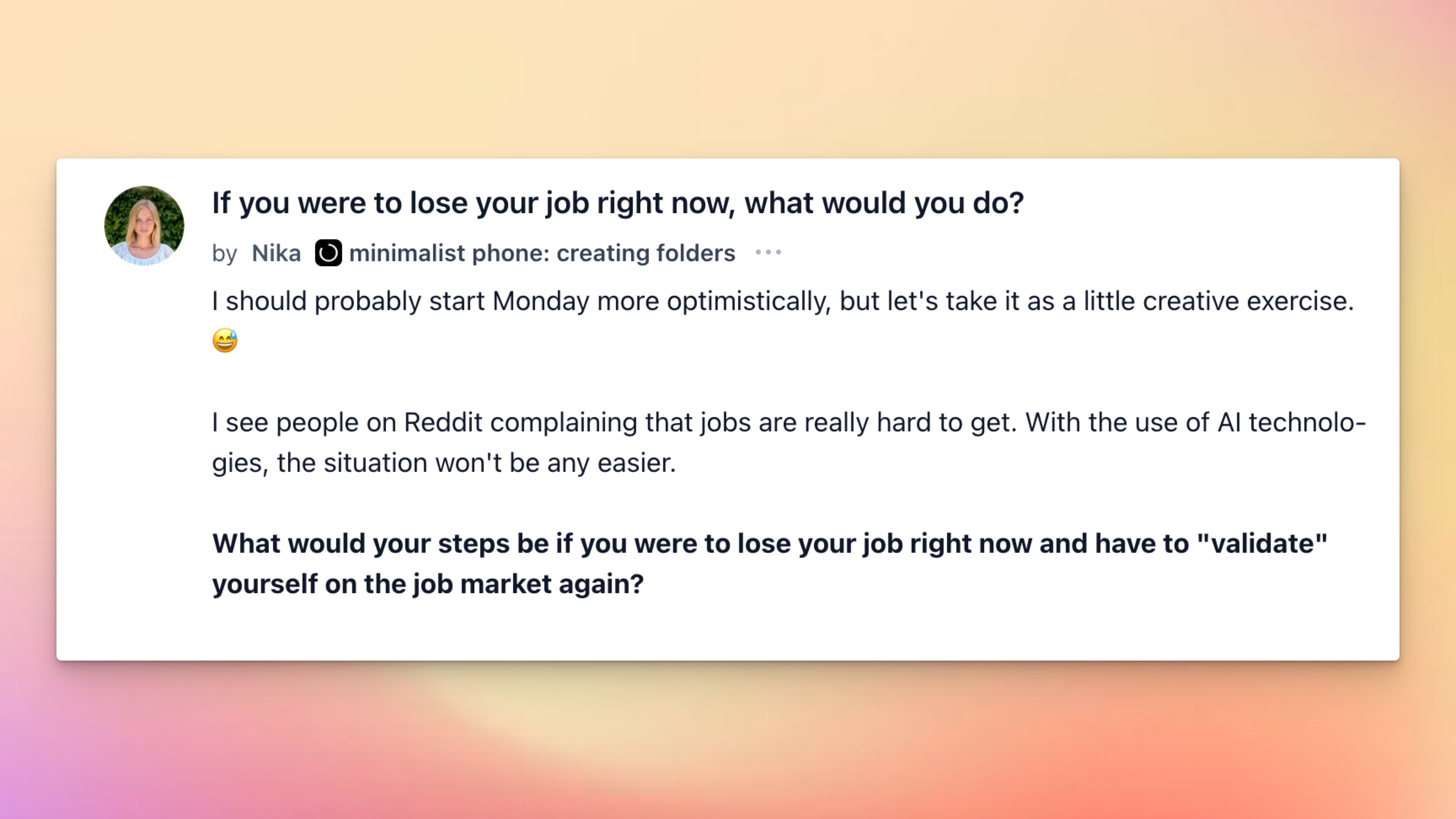 She frames it as a thought experiment: what’s your move if the paycheck stops tomorrow? Do you jump into freelancing, consulting, or shipping a quick product? Do you pivot into something totally different? Or do you take a step back and breathe before making the next call? The thread turns into a mix of backup plans, survival tactics, and a little raw honesty about how scary the question really is.
