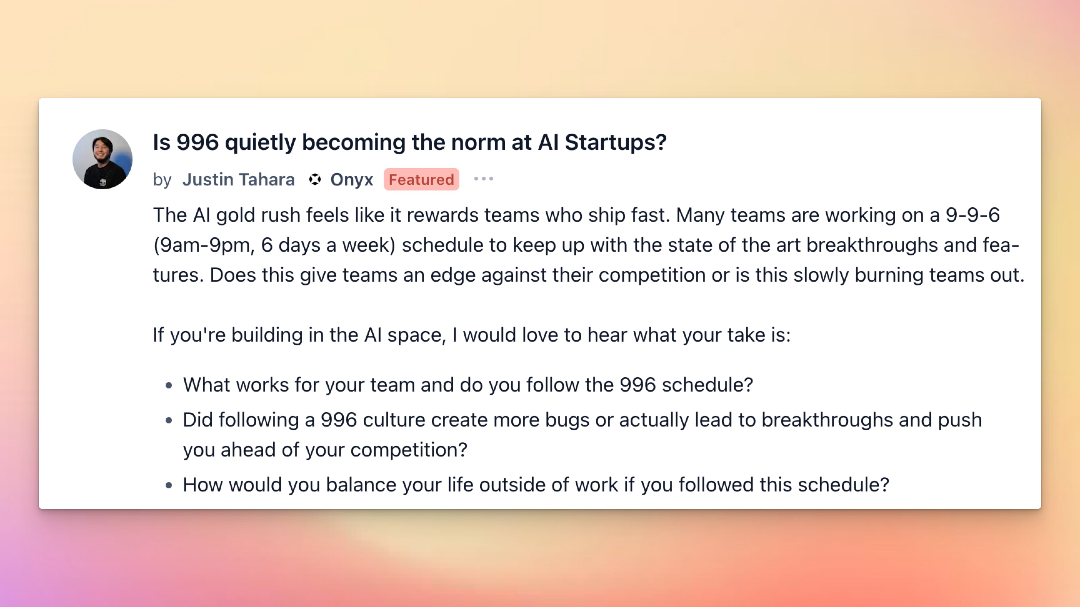 Justin Tahara asks if the grind culture of 9-to-9, six days a week is quietly becoming the norm at AI startups. Some folks admit the pressure to ship fast is real, while others, like Lizzie Yuan, push back hard, saying her team draws firm lines around rest and refuses to treat exhaustion as a badge of honor.