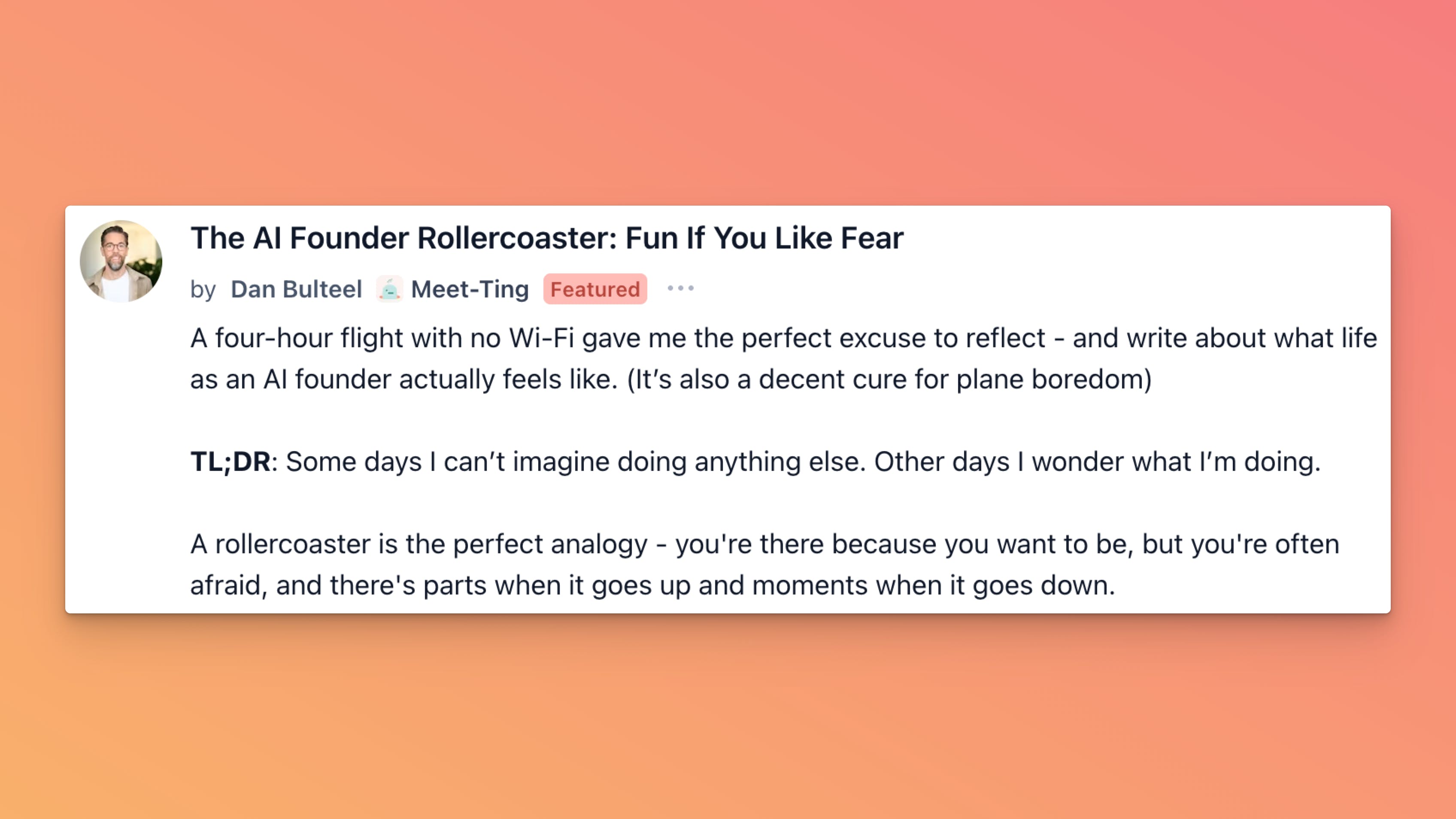 Dan Bulteel writes about the highs and lows of building in AI. He says it’s fun if you’re comfortable with fear, when things break, models fail, funding dries up, and hype evaporates just as fast as it appeared.