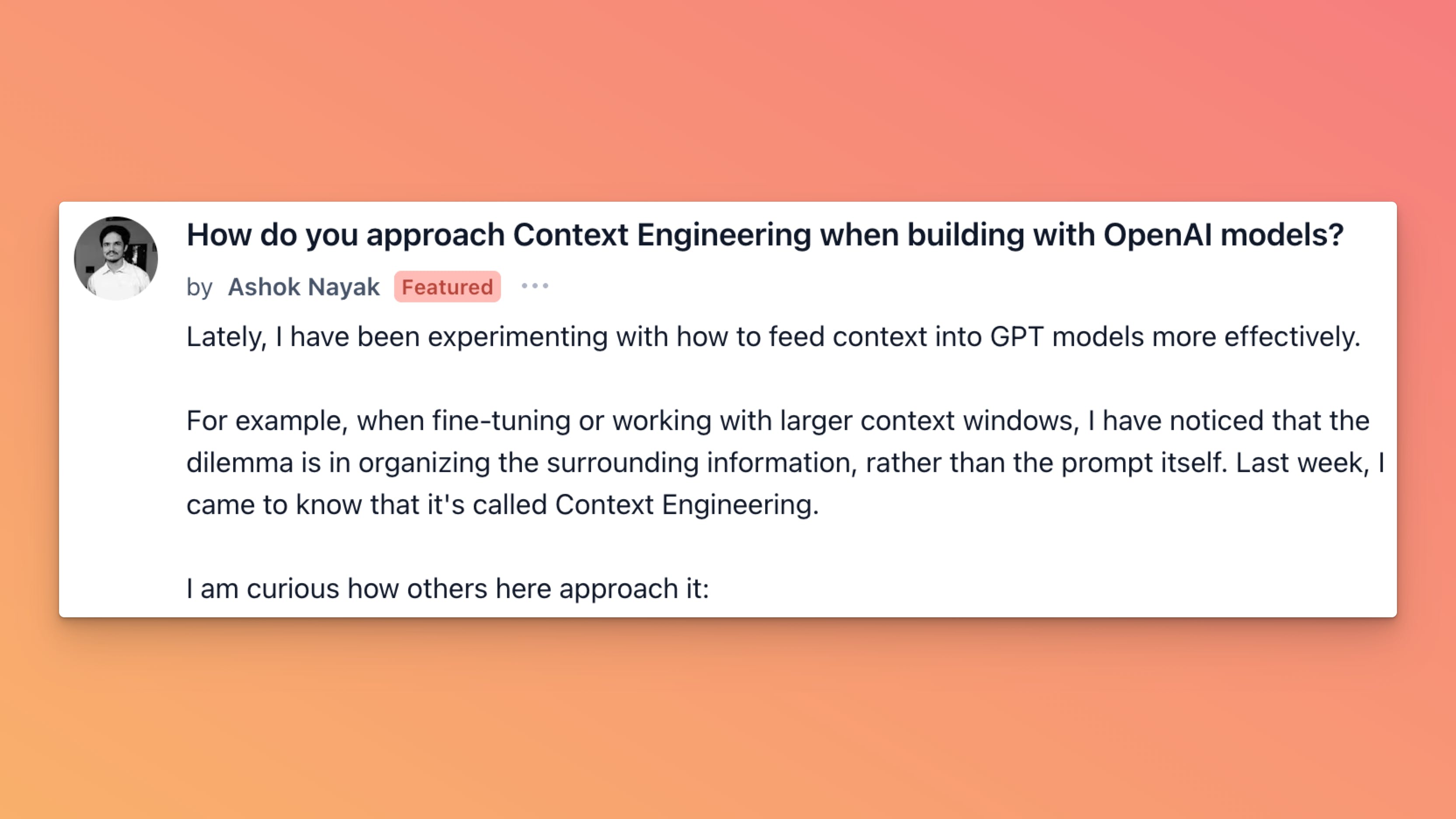 Ashok Nayak started a thread asking how people approach context engineering when working with OpenAI models.