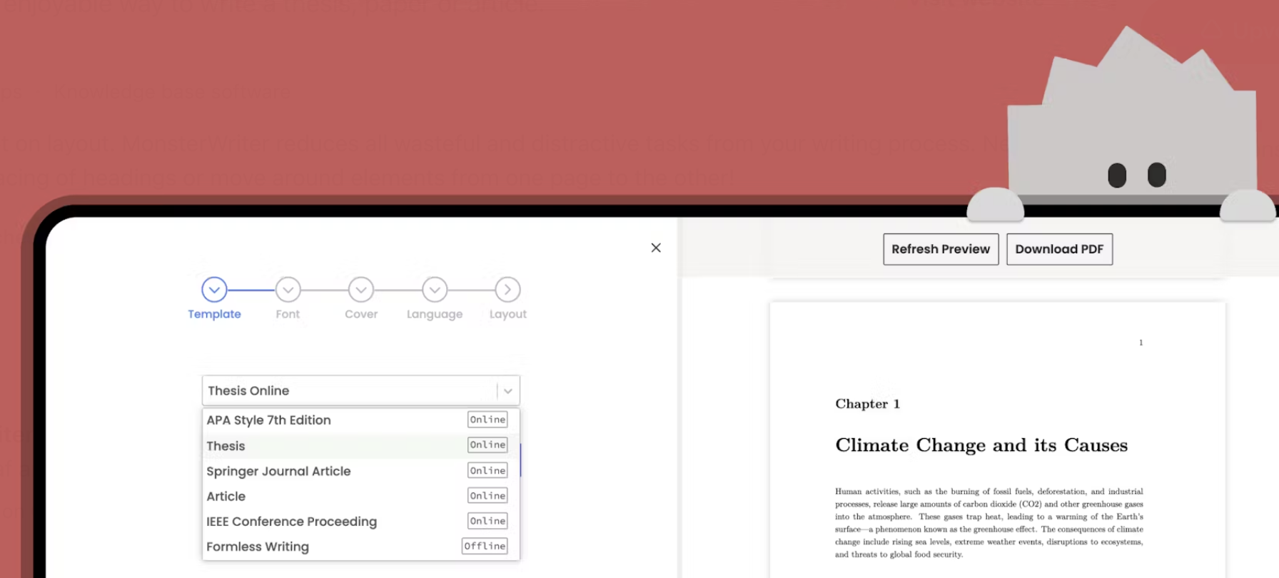 MonsterWriter is a focused writing app built for long-form work. It takes care of structure, references, and formatting so you donāt waste time fixing styles or fighting Word. You just write and export when itās done.