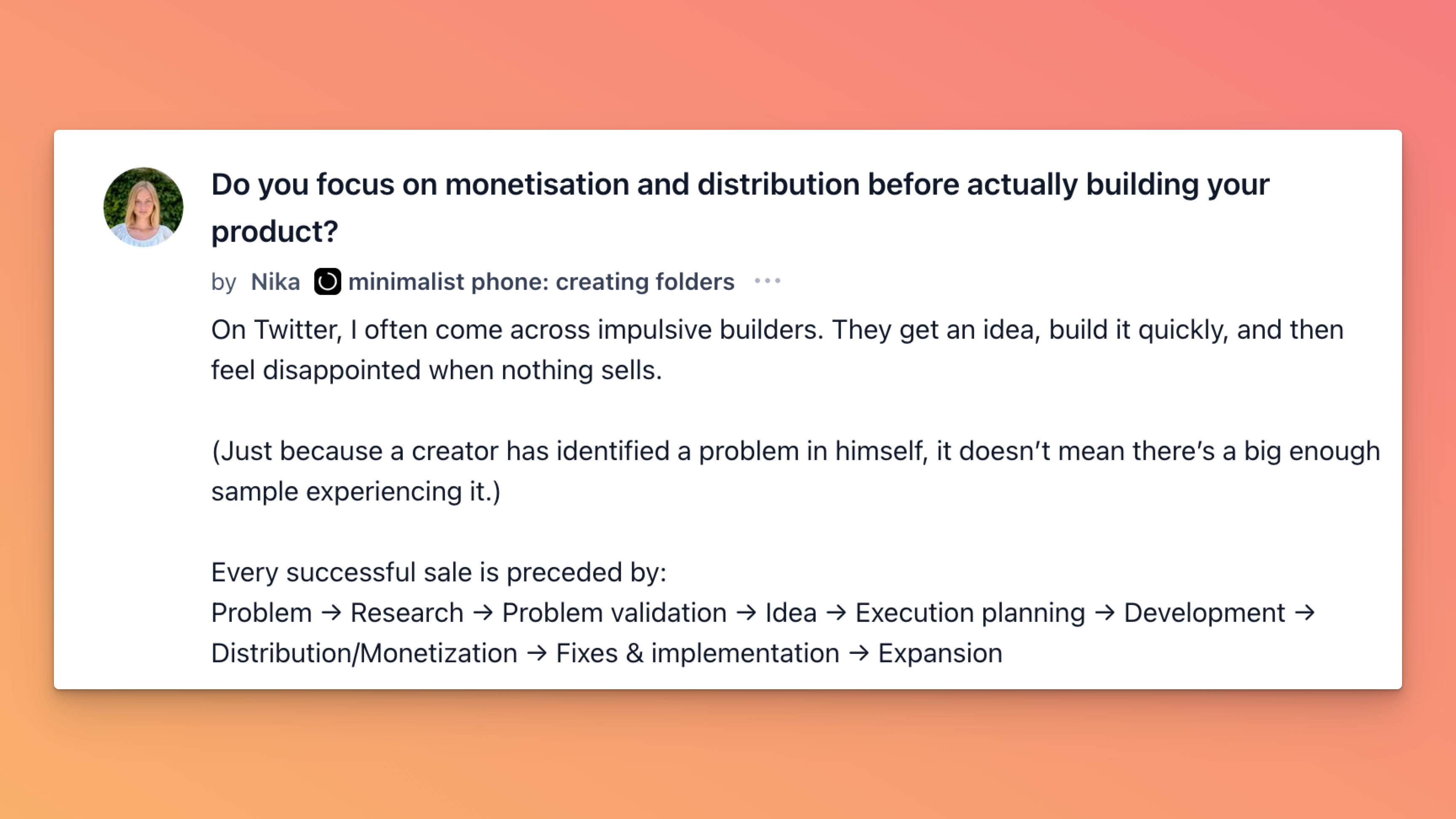 Nika asked whether founders should figure out monetisation and distribution before building anything. The responses split fast. Some said itās pointless to build without knowing how youāll make money. Others said you canāt price or pitch what doesnāt exist. The real answer sat somewhere betweenābuild enough to prove itās worth selling, then worry about how to sell it.